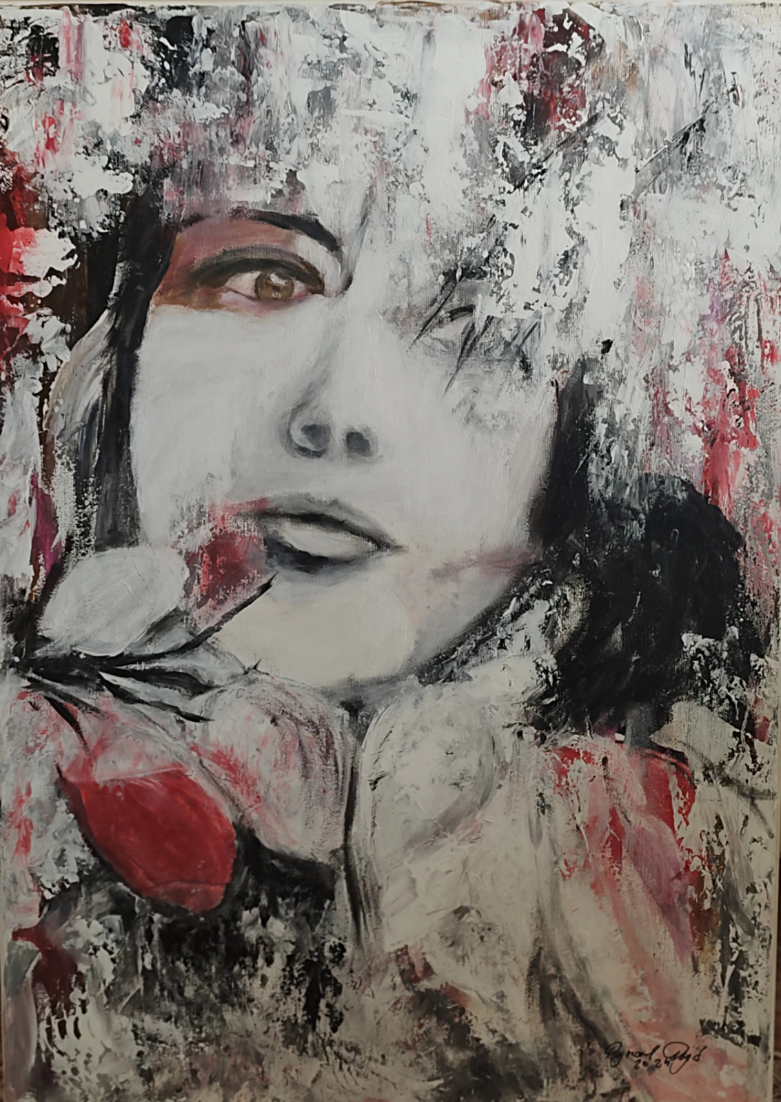 Obraz przedstawia twarz kobiety, która wyłania się z gęstej, niemal chaotycznej tekstury farby. Centralnym punktem kompozycji jest jej prawe oko – oddane z dużą precyzją, o ciepłej, brązowej barwie, która kontrastuje z chłodną, bladą cerą. Spojrzenie jest zamyślone, nieco smutne, skierowane w dal, co nadaje całości melancholijnego charakteru.