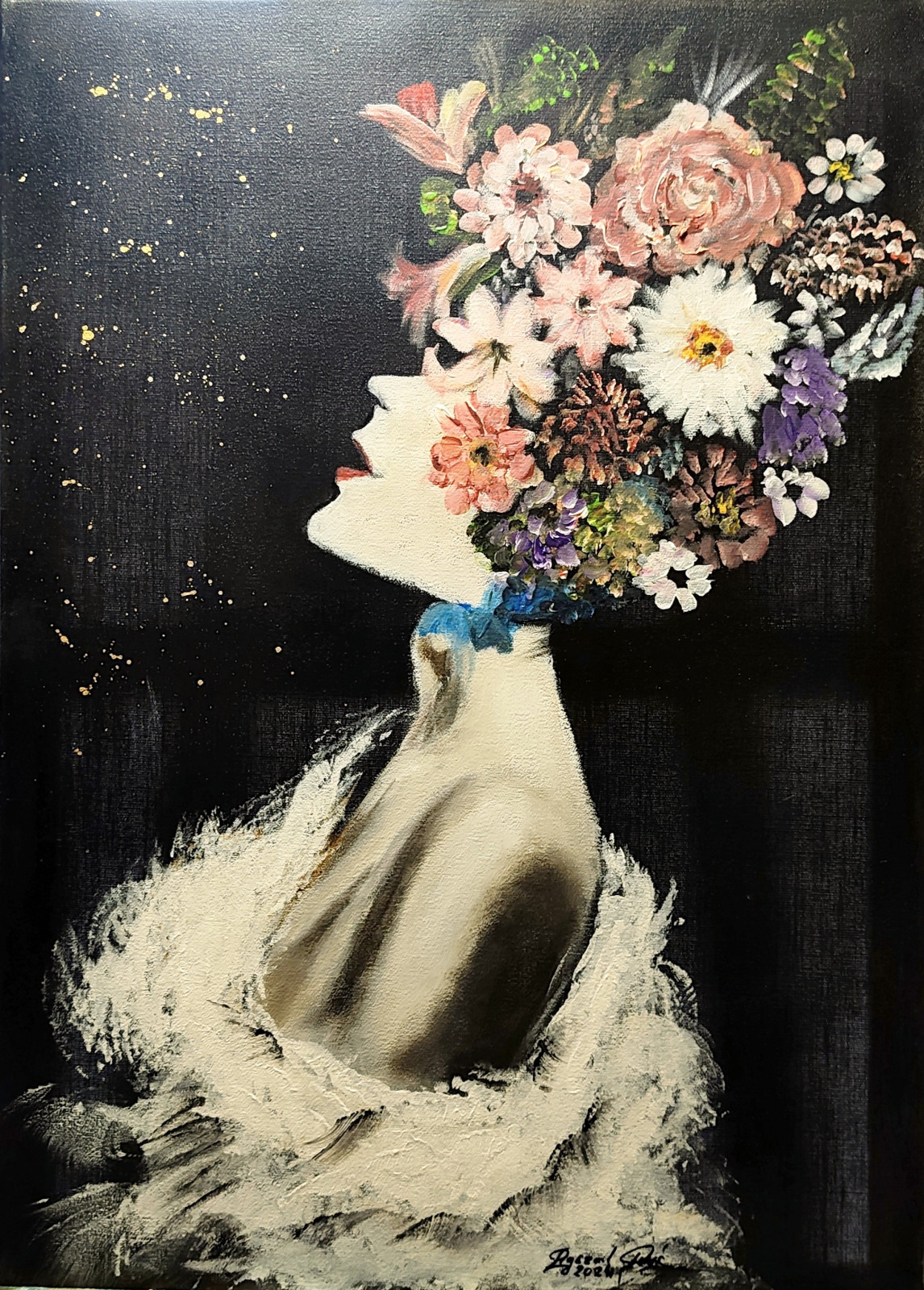 To portret ciszy, która krzyczy kolorami. Kobieta zastyga w geście oczekiwania, a jej umysł eksploduje ogrodem marzeń. Każdy kwiat to inna myśl, inne wspomnienie, a puszyste futro otula ją przed chłodem rzeczywistości. Złote iskry w tle to ulotne chwile inspiracji, które łapie w locie. To obraz o tym, że najpiękniejsze rzeczy dzieją się w naszej głowie, gdy nikt nie patrzy.