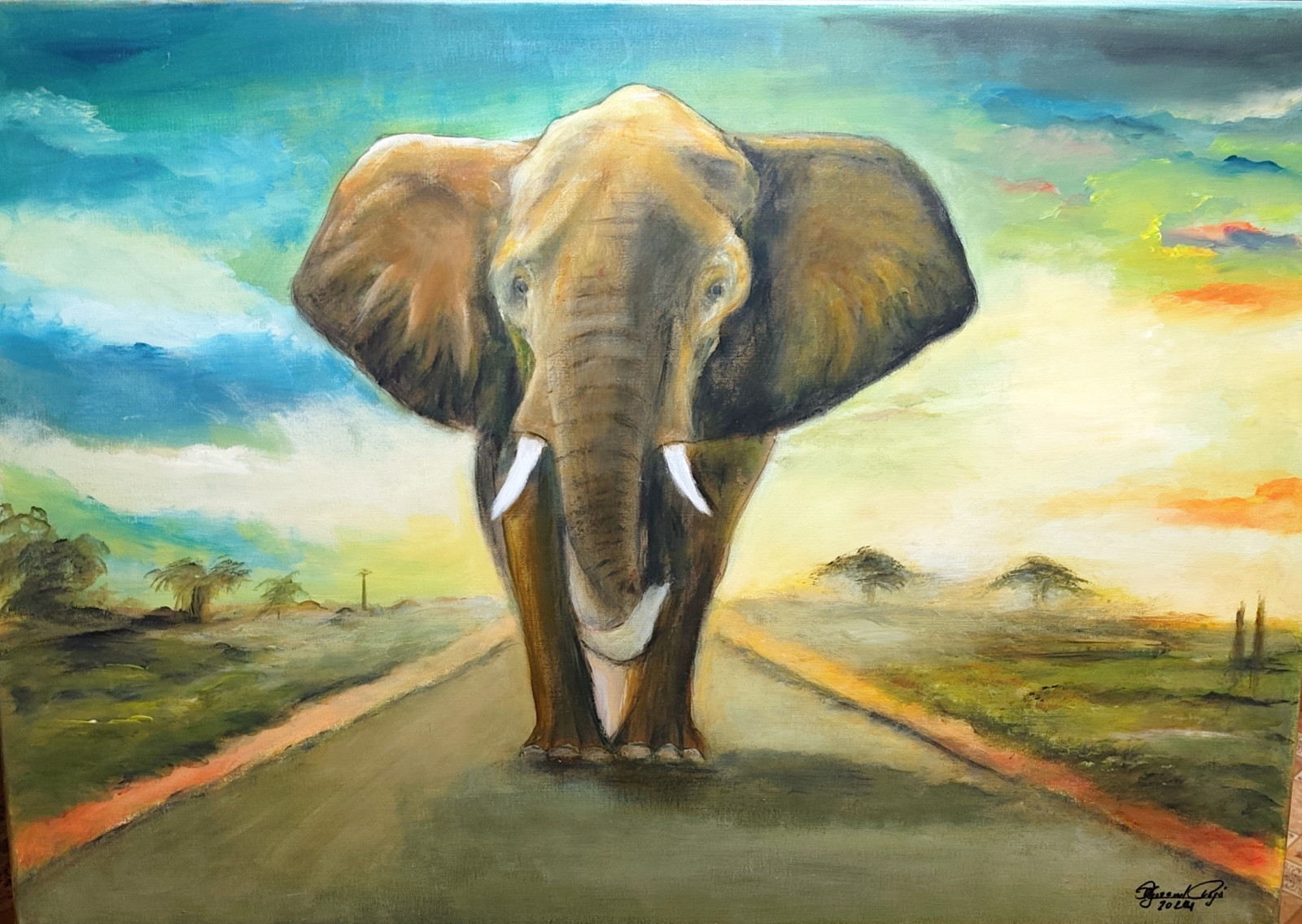 Oferuję ręcznie malowany obraz akrylowy na płótnie, przedstawiający monumentalną sylwetkę słonia afrykańskiego kroczącego drogą na wprost widza. To kompozycja pełna siły i dostojeństwa, która zdominuje wnętrze swoim charyzmatycznym oddziaływaniem.