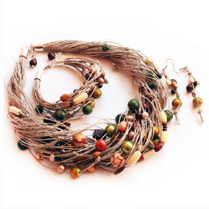 ( woskowanej i nabłyszczanej) w kolorze uniwersalnej szarości, ożywionej bursztynowymą oliwką oraz ecru. Koraliki szklane, drewniane oraz akrylowe w różnych rozmiarach. Komplet wykończony jest metalem antyalergicznym, bez niklu i ołowiu.