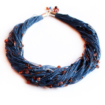 Naszyjnik wykonany z pęczku miękkiej wysokojakościowej przędzy lnianej ( woskowanej i nabłyszczanej) w kolorze granatowym ożywionej bursztynowymi brązami koralików..