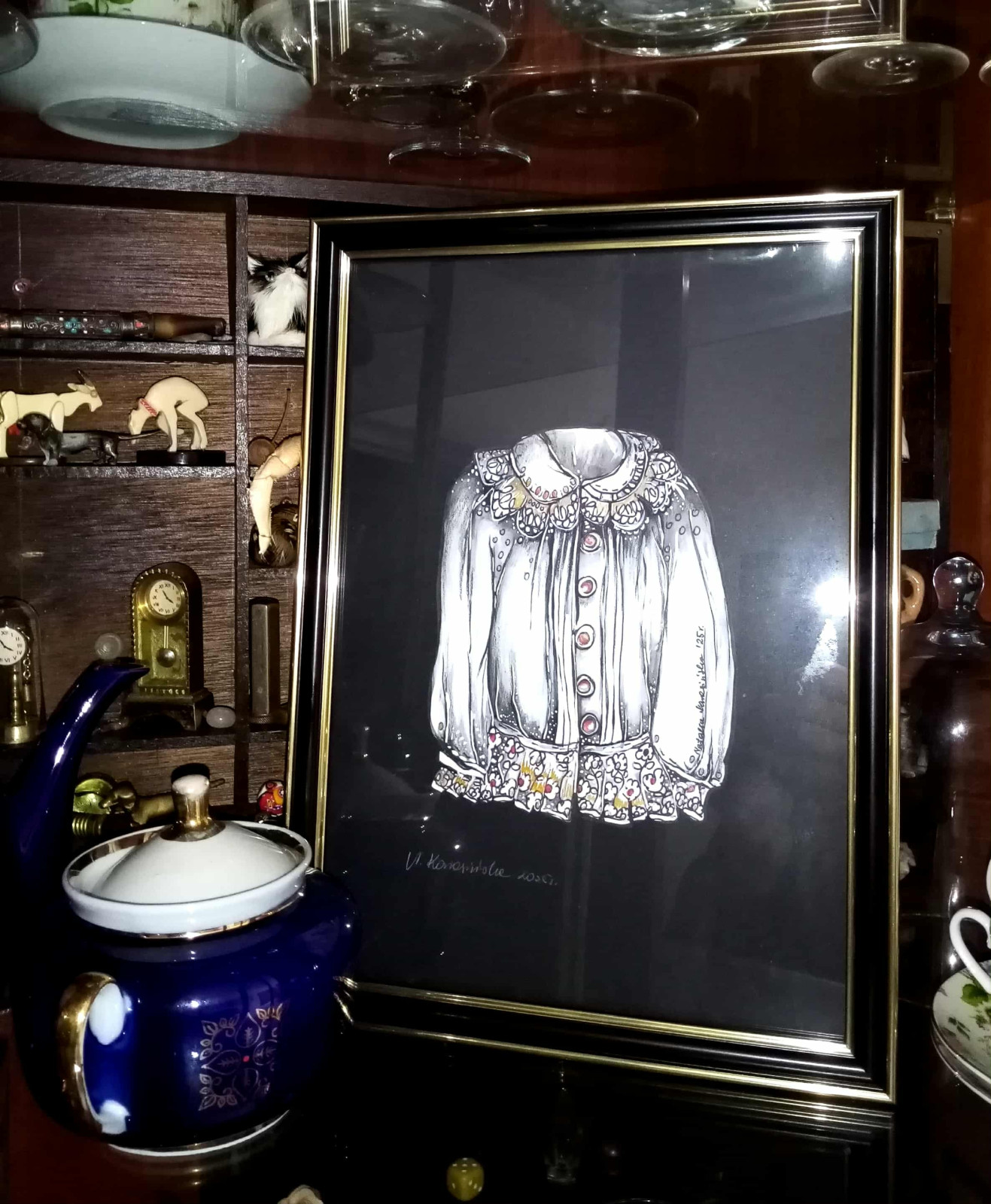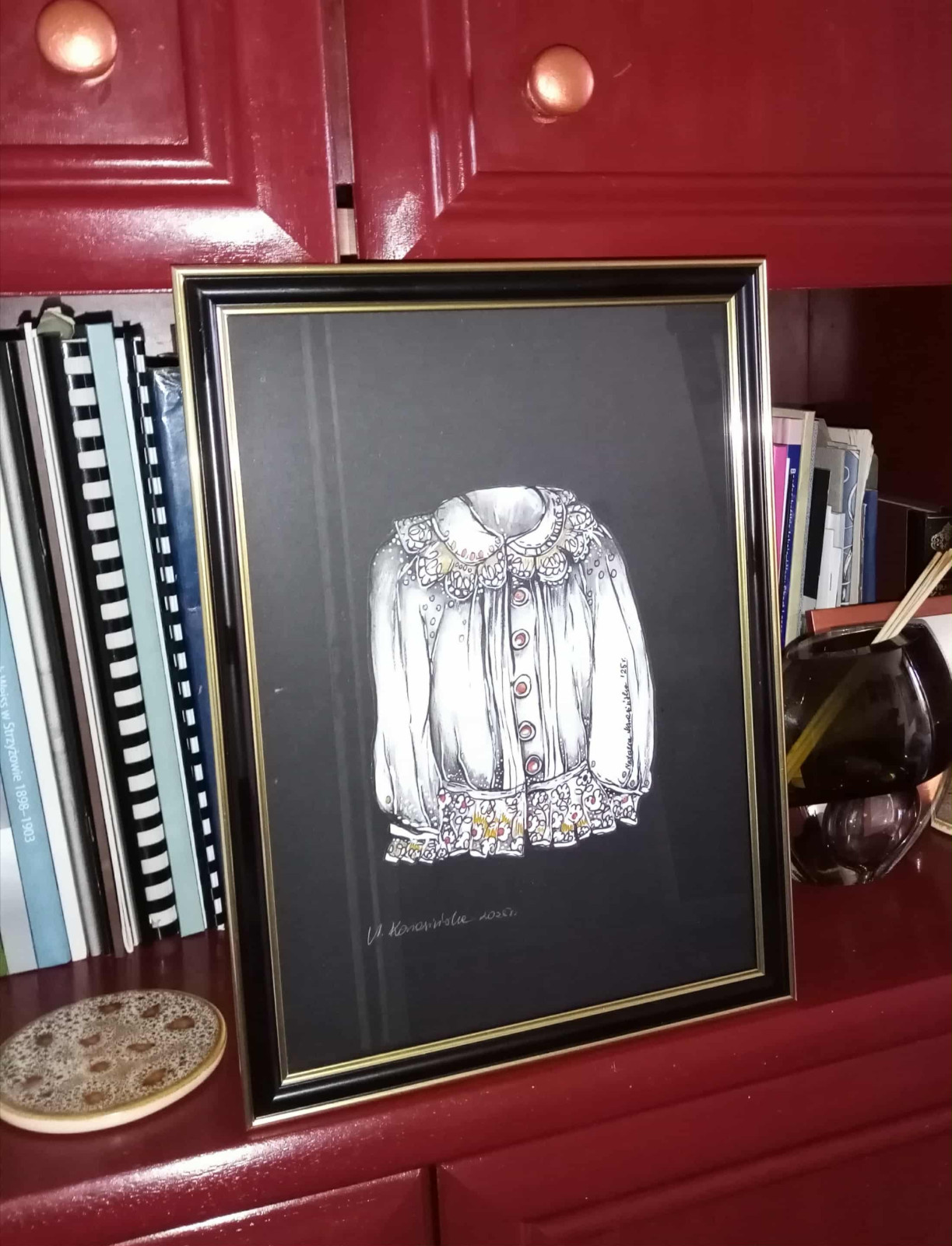 SZATA ZDOBI CZŁOWIEKA to mój kolejny najnowszy cykl!. Każdy projekt koszulki został narysowany ręcznie, a następnie wycięty, umieszczony na eleganckim czarnym tle i oprawiony w stylową złotą ramkę. 🖼️