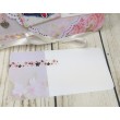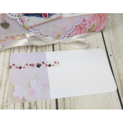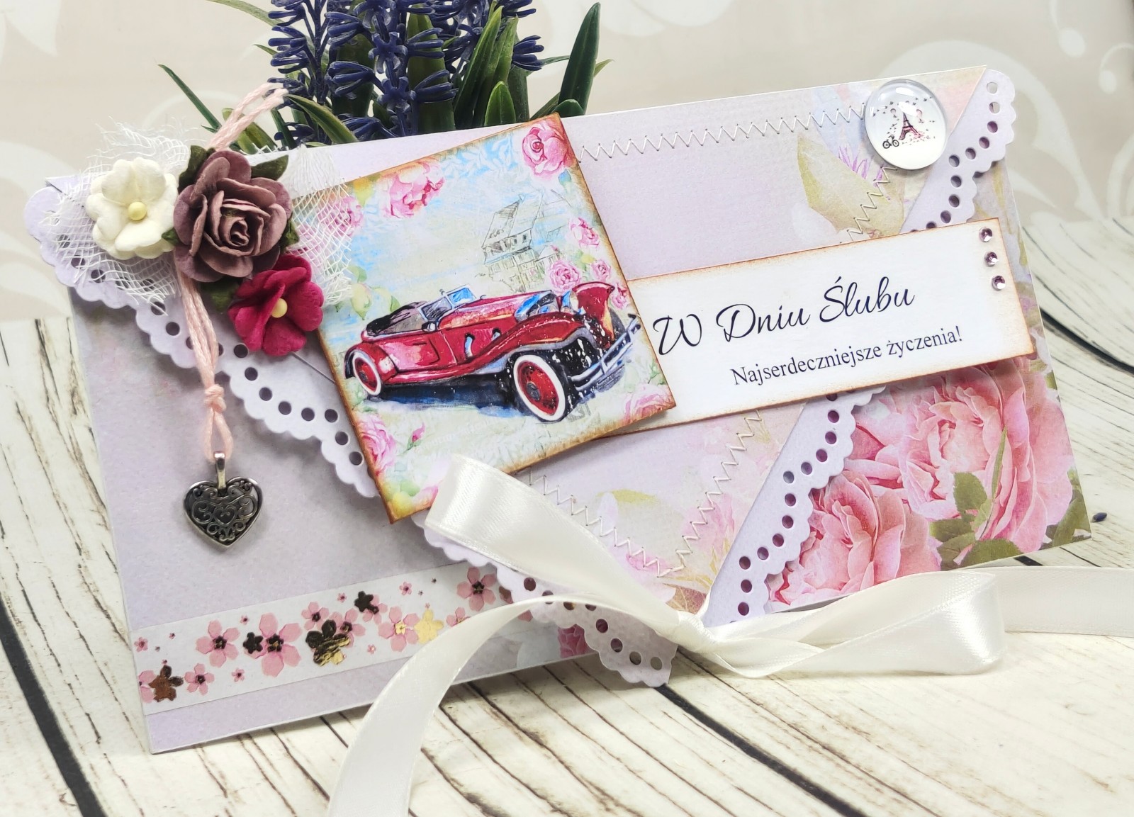 Elegancka i delikatna kartka kopertówka wykonana z wysokiej jakości papierów do scrapbookingu, obszywana maszynowo. Kartka ozdobiona papierowymi kwiatami, metalową zawieszka, oraz szklanym kaboszonem. W środku znajduje się wkładka na życzenia.