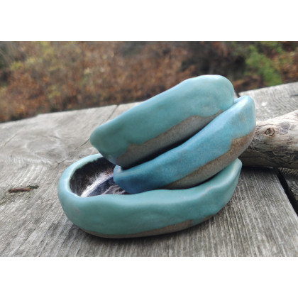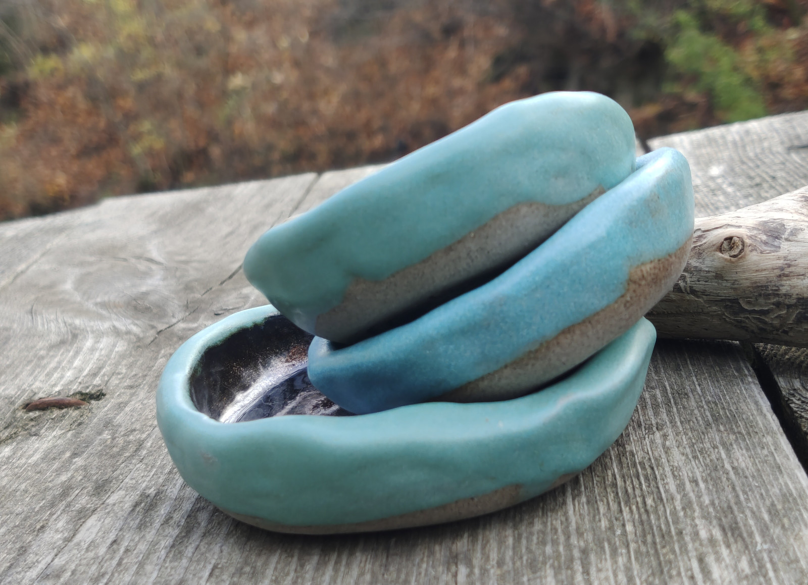 Idealnie nadadzą się jako podstawki na tealighty, mniejsze świece, biżuterię, lub inne drobiazgi. Szkliwa w kolorze turkusu oraz miedzianego brązu. Szkliwo w środku NIE nadaje się do kontaktu z mokrą żywnością typu sosy itp.