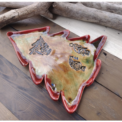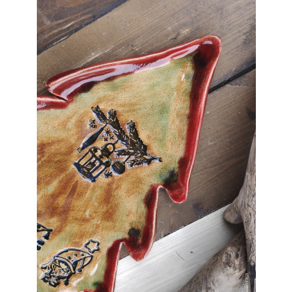 Ceramiczny świąteczny talerz w kształcie choinki. Formowany ręcznie z beżowej gliny. Wypalany dwukrotnie w piecu ceramicznym. Szkliwa spożywcze w kolorze czerwieni, brązu oraz zieleni. Uroku dodaje motyw lampionu, oraz zimowych skrzatów. Idealnie sprawdzi się jako podstawka na ciasteczka, świece lub świąteczne aranżacje. Zostanie zapakowany dekoracyjnie, oraz dobrze zabezpieczony na czas transportu.
