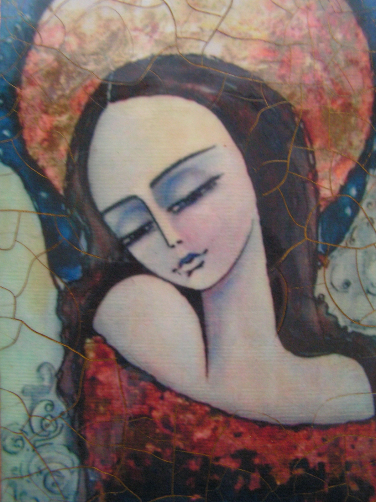 Anioł Cierpliwości - obrazek na płótnie, wykonany metodą decoupage z zastosowaniem złoceń i spękań.