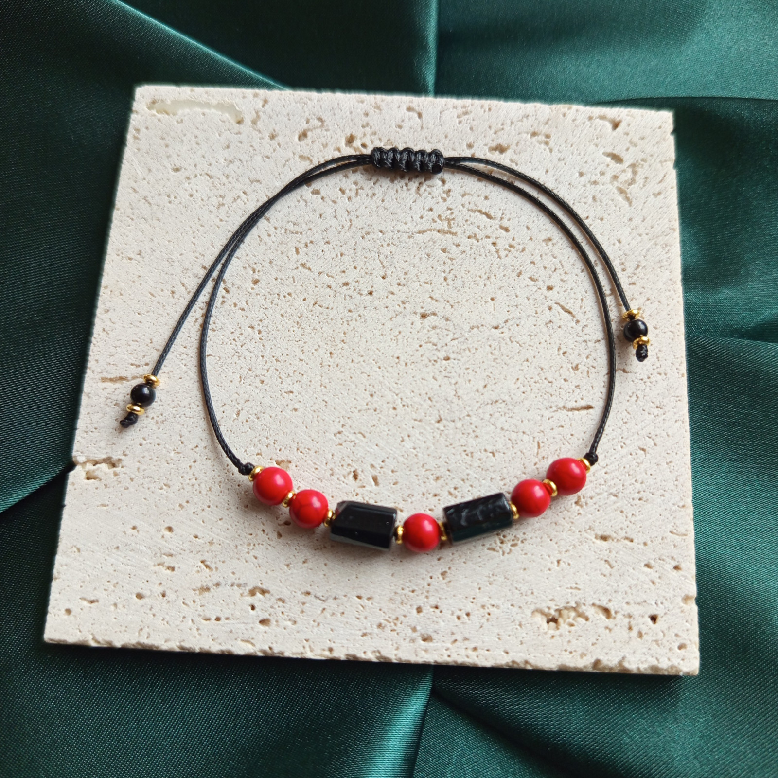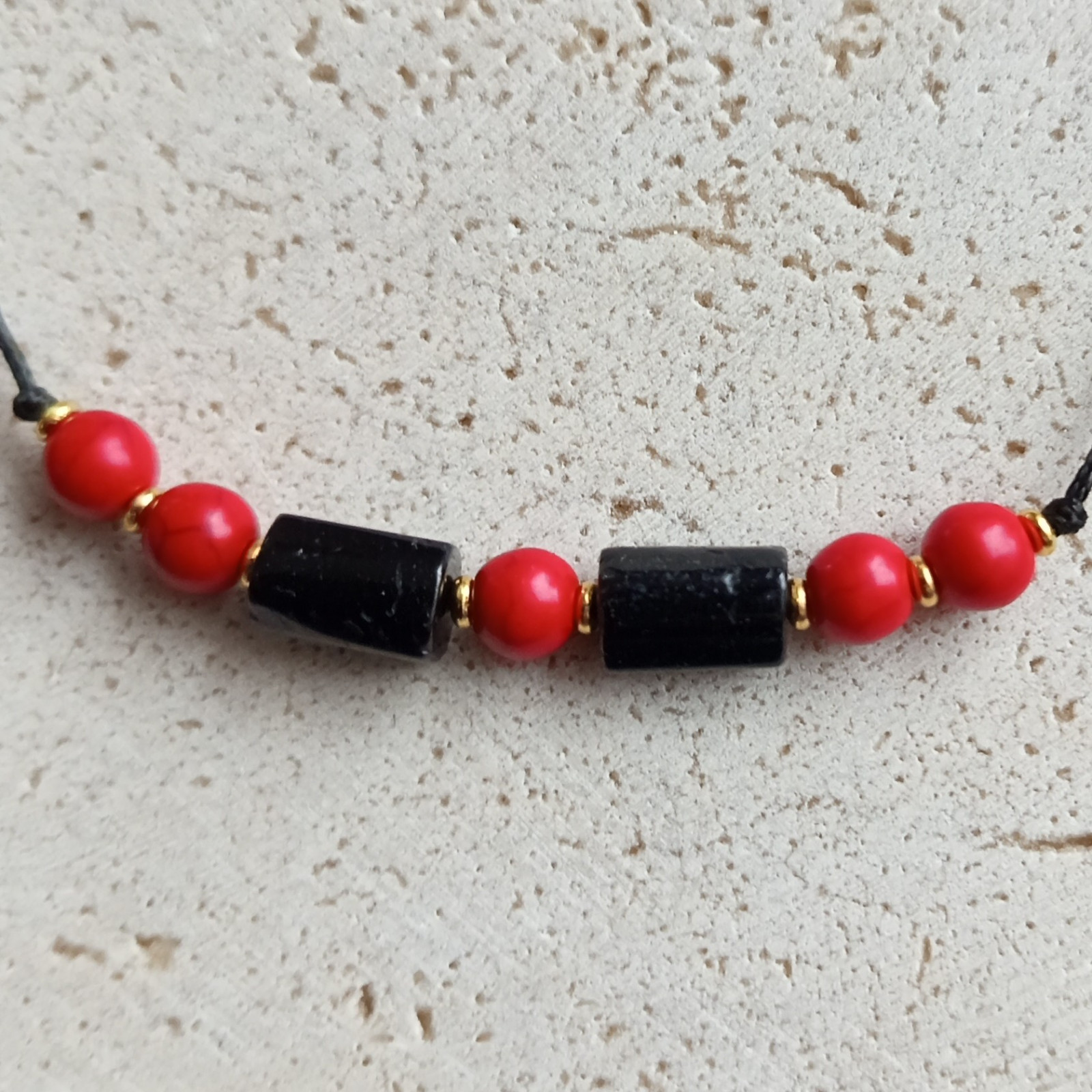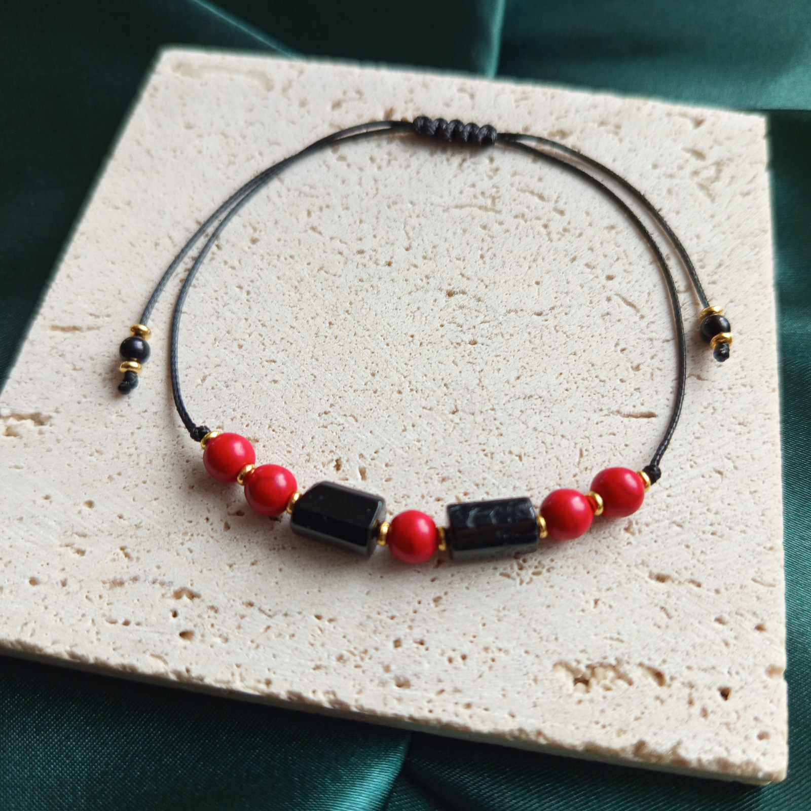 Roma - bransoletka wykonana z kamieni naturalnych i mocnego sznurka jubilerskiego. Regulacja za pomocą plecionki makramowej. Wyrazista dzięki połączeniu głębokiej czerni i radosnej czerwieni - klasyk, który nigdy nie wychodzi z mody.