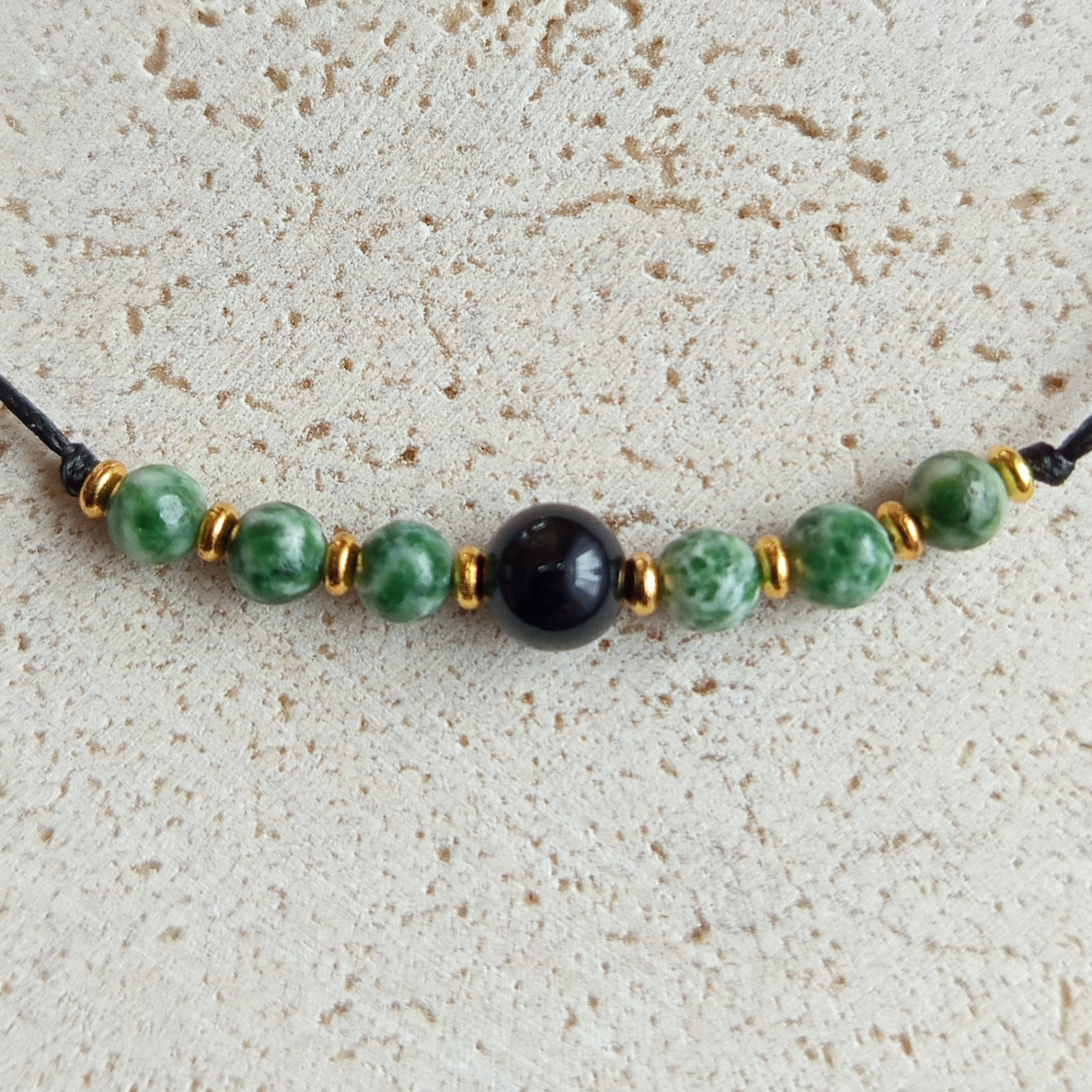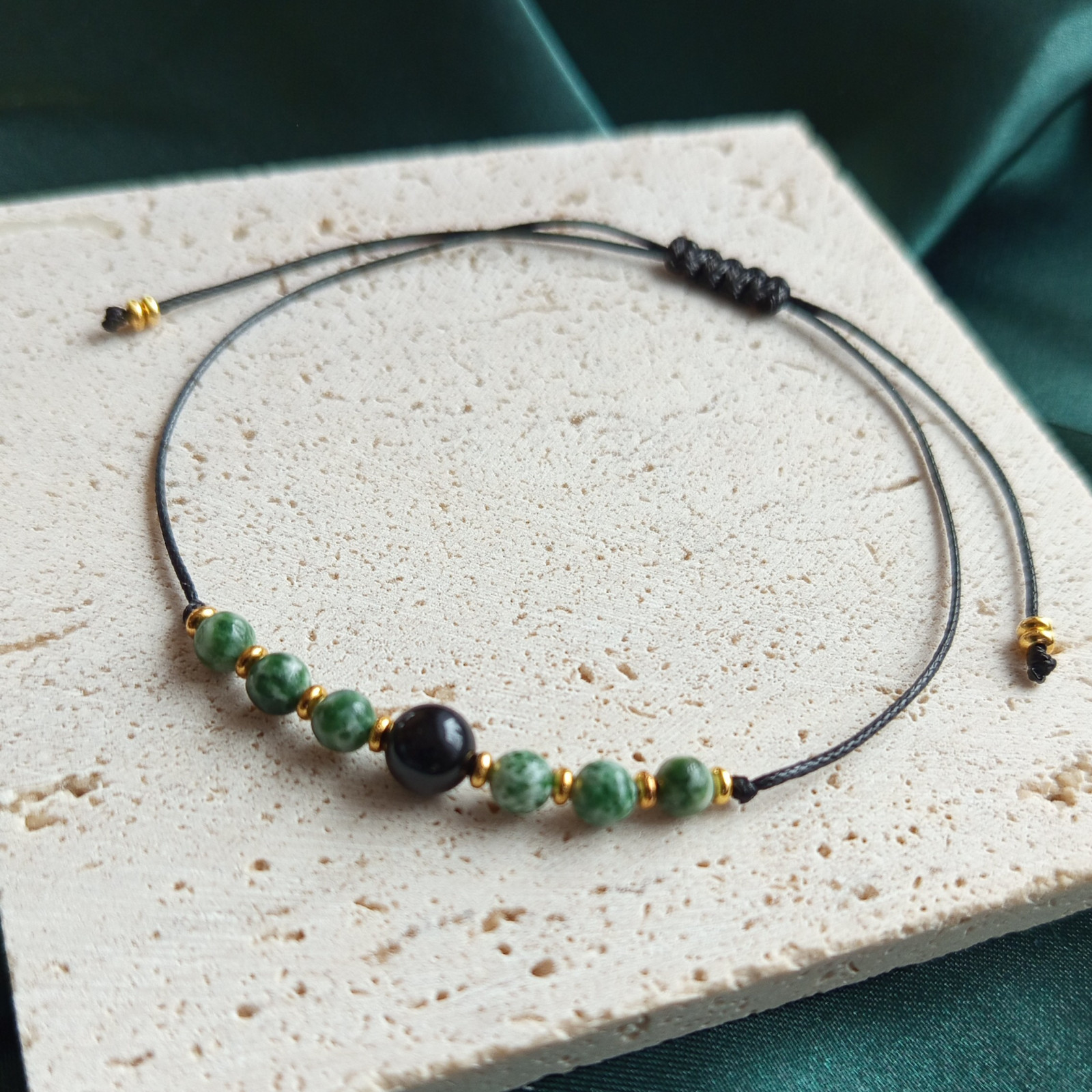 Roxi - bransoletka wykonana z kamieni naturalnych i ozdobnego, mocnego sznurka jubilerskiego. Regulacja za pomocą plecionki makramowej. Lekka i bardzo wygodna w noszeniu, odpowiednia na co dzień.
