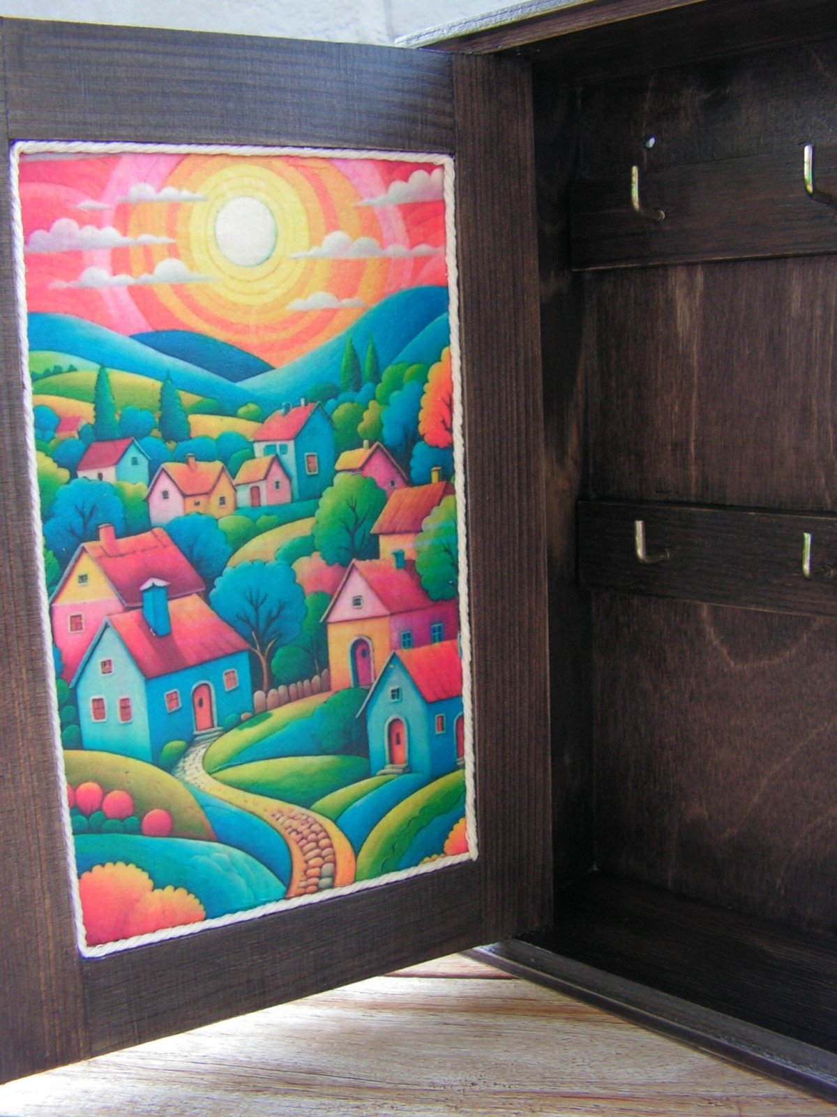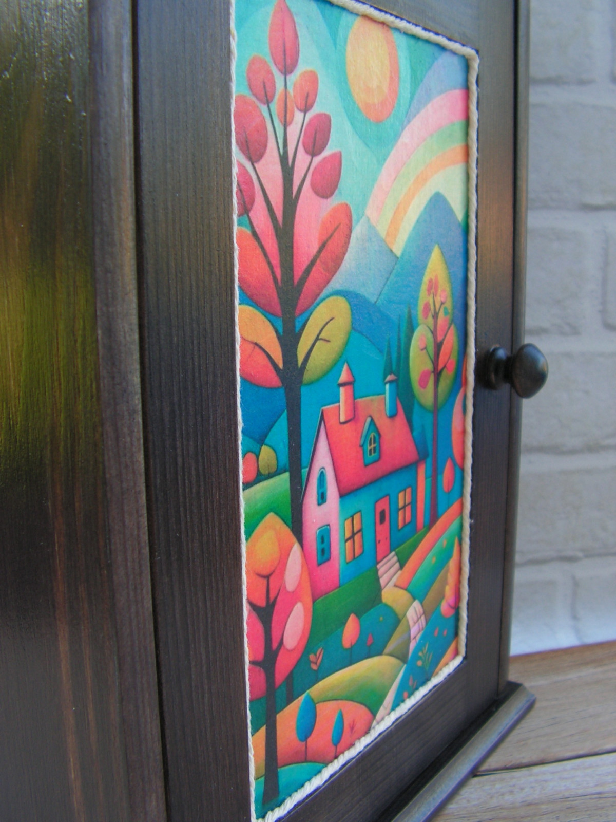 Drewniana, prostokątna szafka na klucze ozdobiona metodą decoupage.