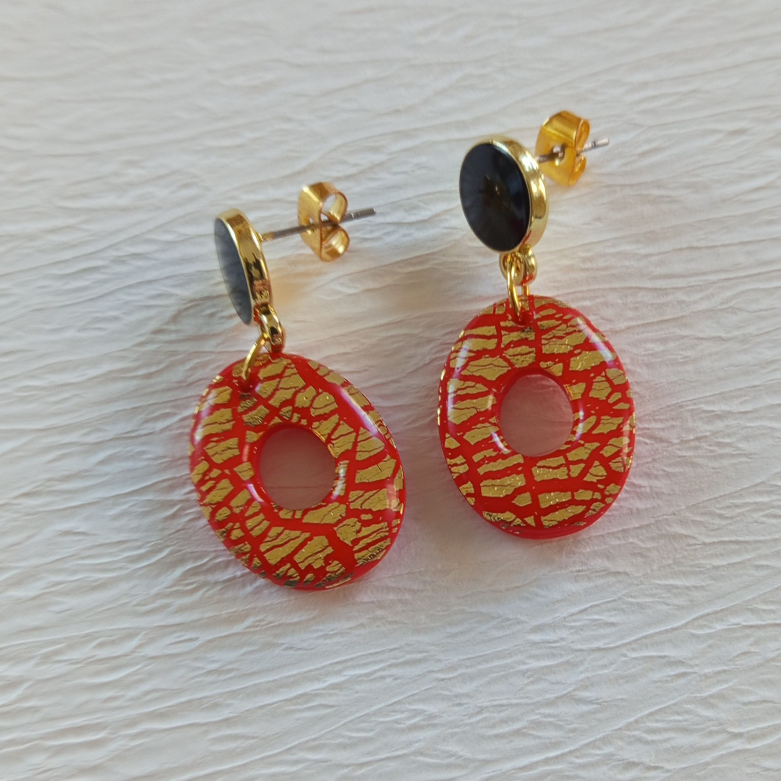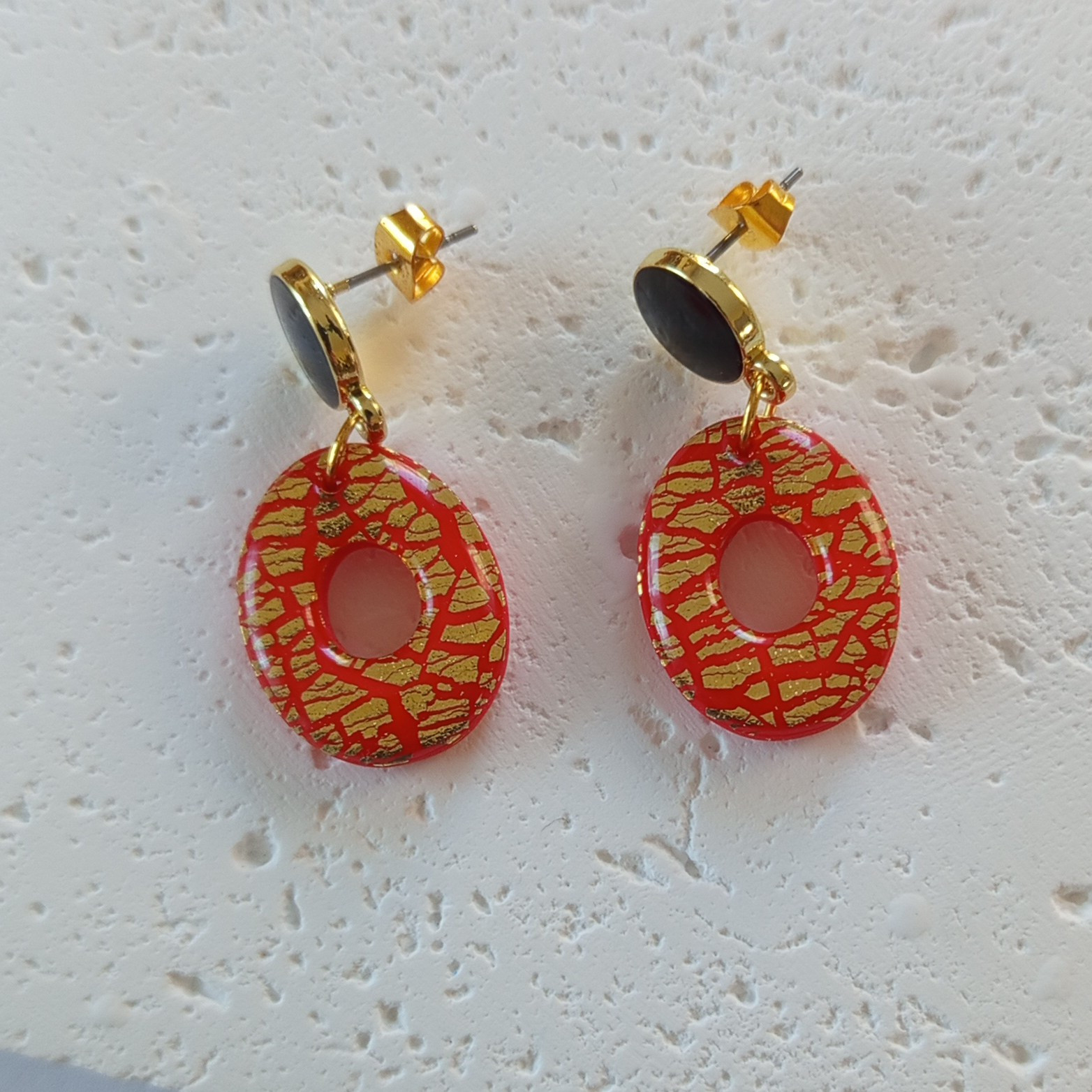 Złoty wzór na energetycznym czerwonym tle. Pokryte z obu stron żywicą.