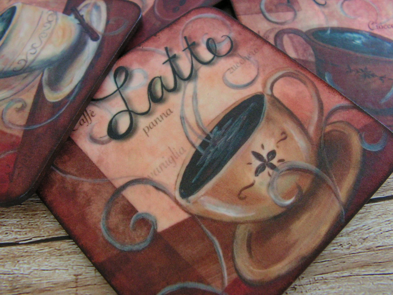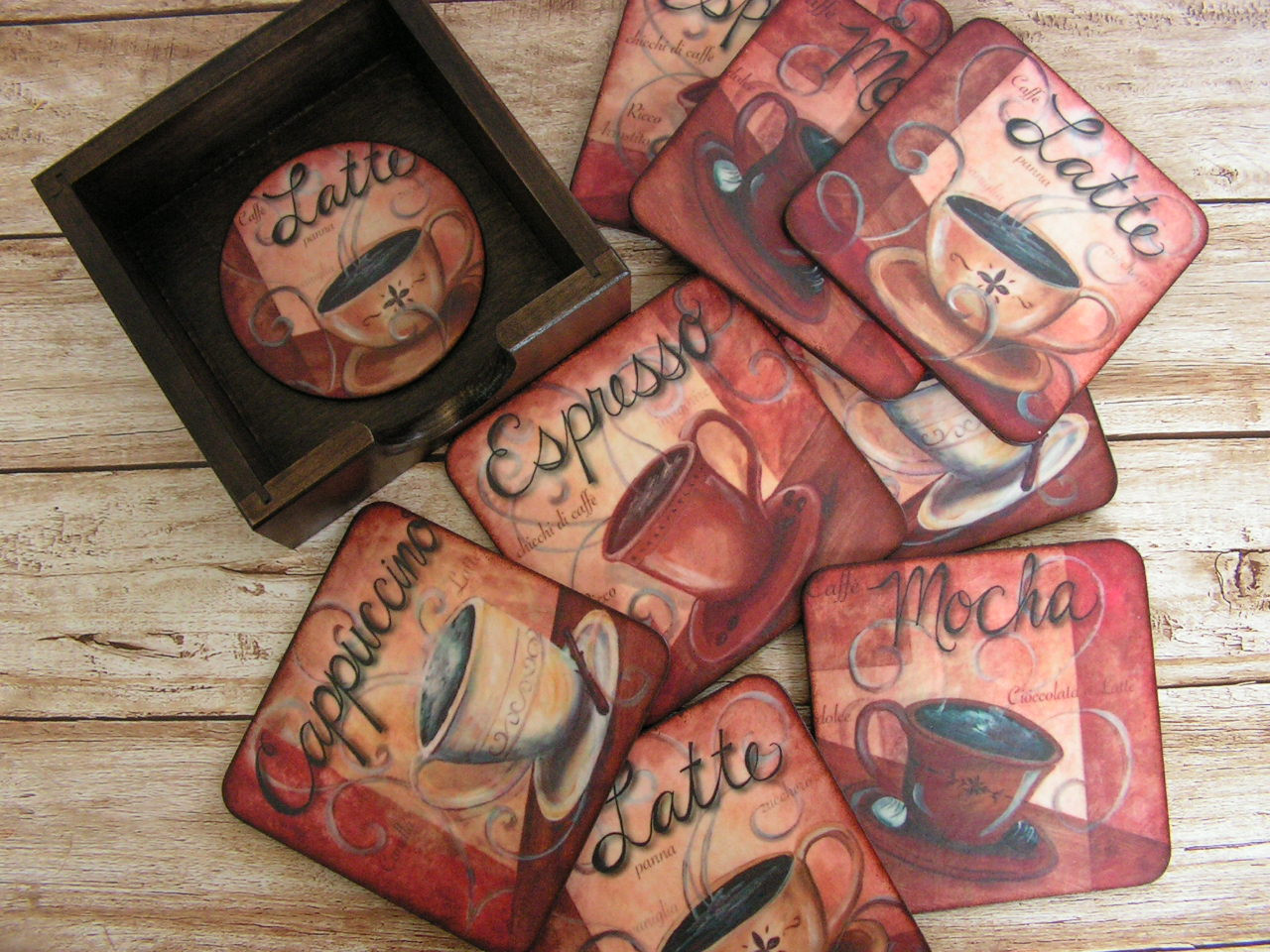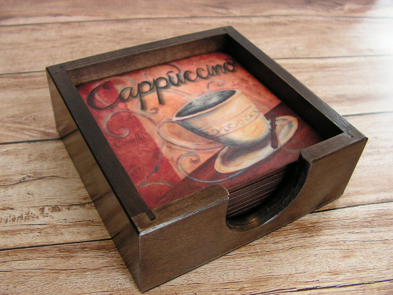Podkładki i pudełko pomalowane bejcą wodną w kolorze belgijska czekolada i ozdobione techniką decoupage.