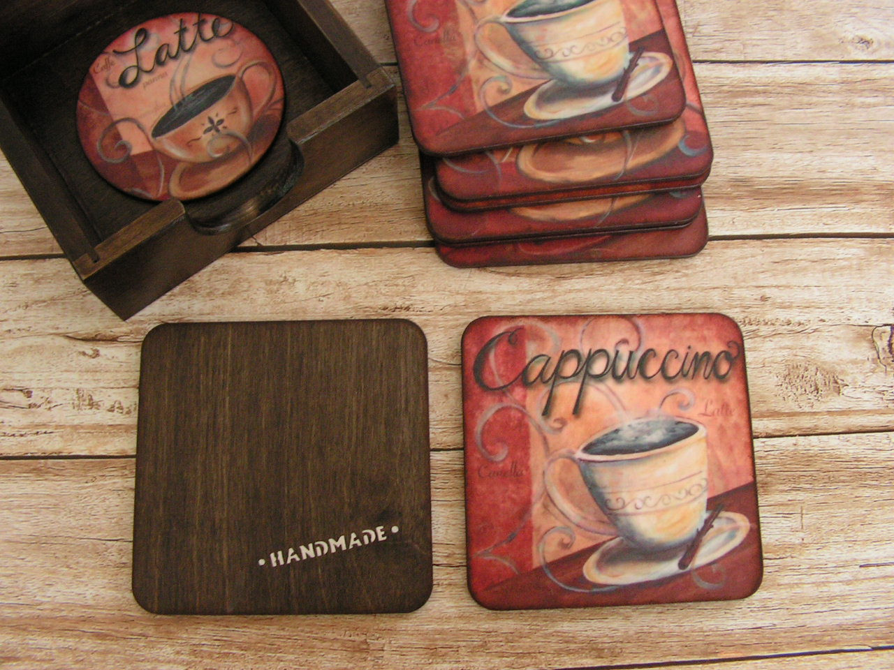 Elegancki komplet aż 8 drewnianych podkładek pod kubki, szklanki lub filiżanki, umieszczony w otwartym drewnianym pudełku.
