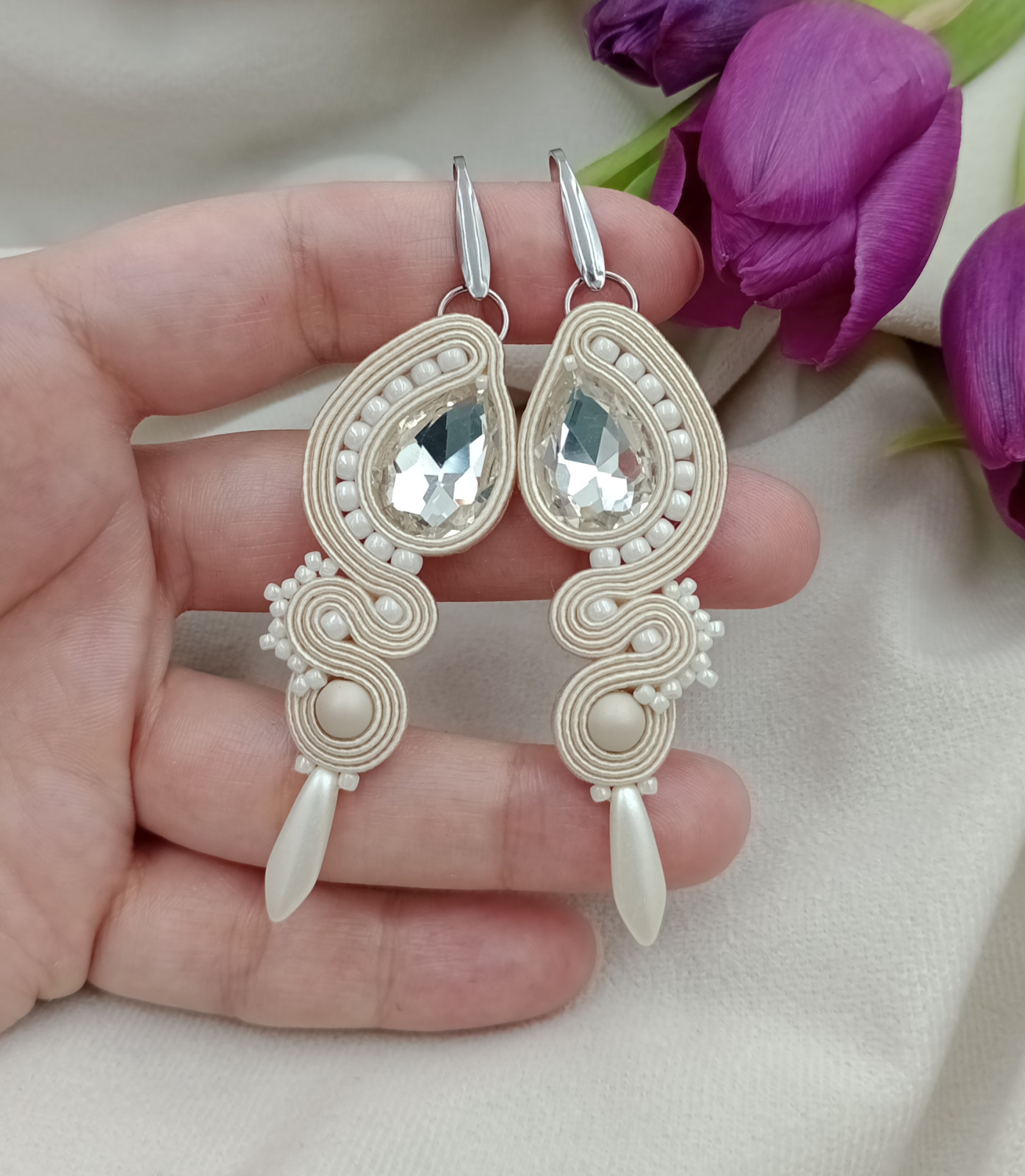 Długie kolczyki ecru, długie śmietankowe kryształowe kolczyki, kolczyki soutache