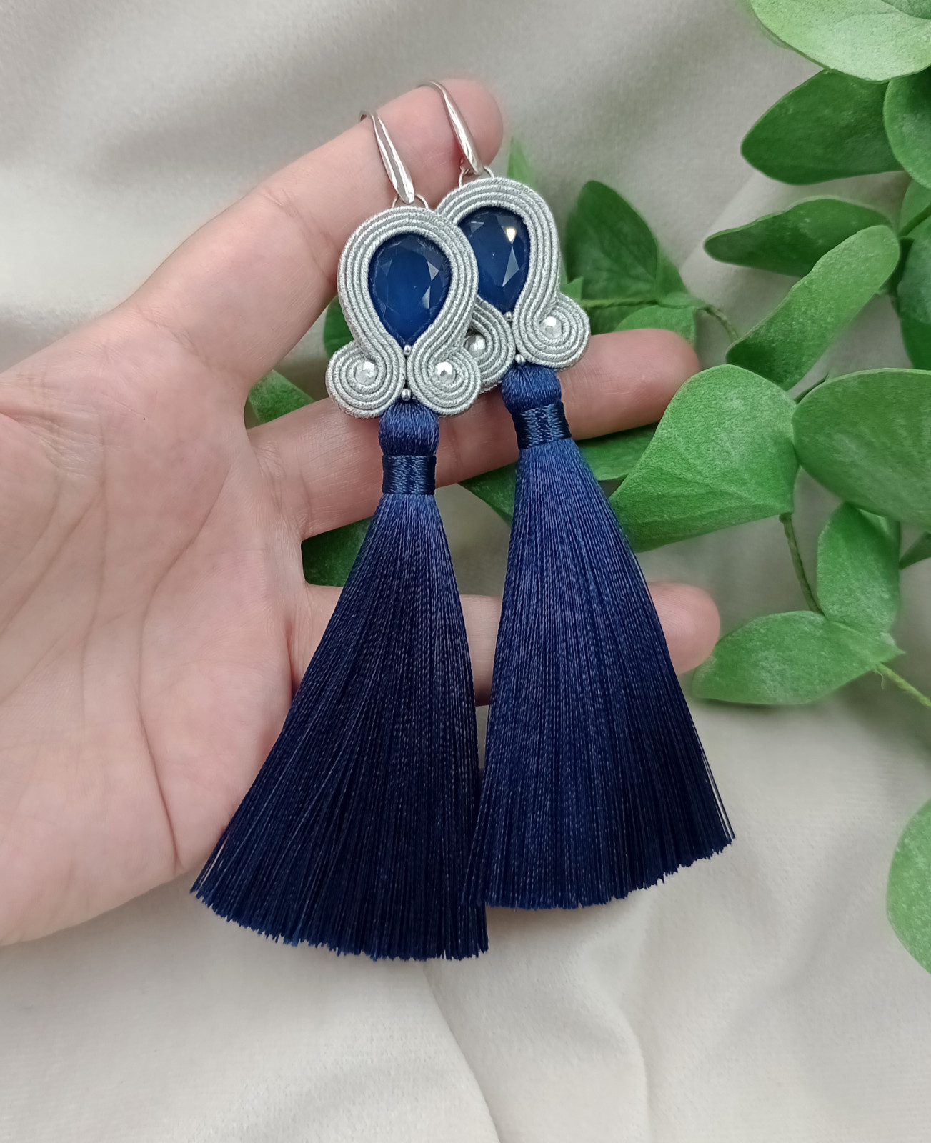 Długie kolczyki z chwostami, granatowe chwosty klipsy sztyfty soutache sutasz