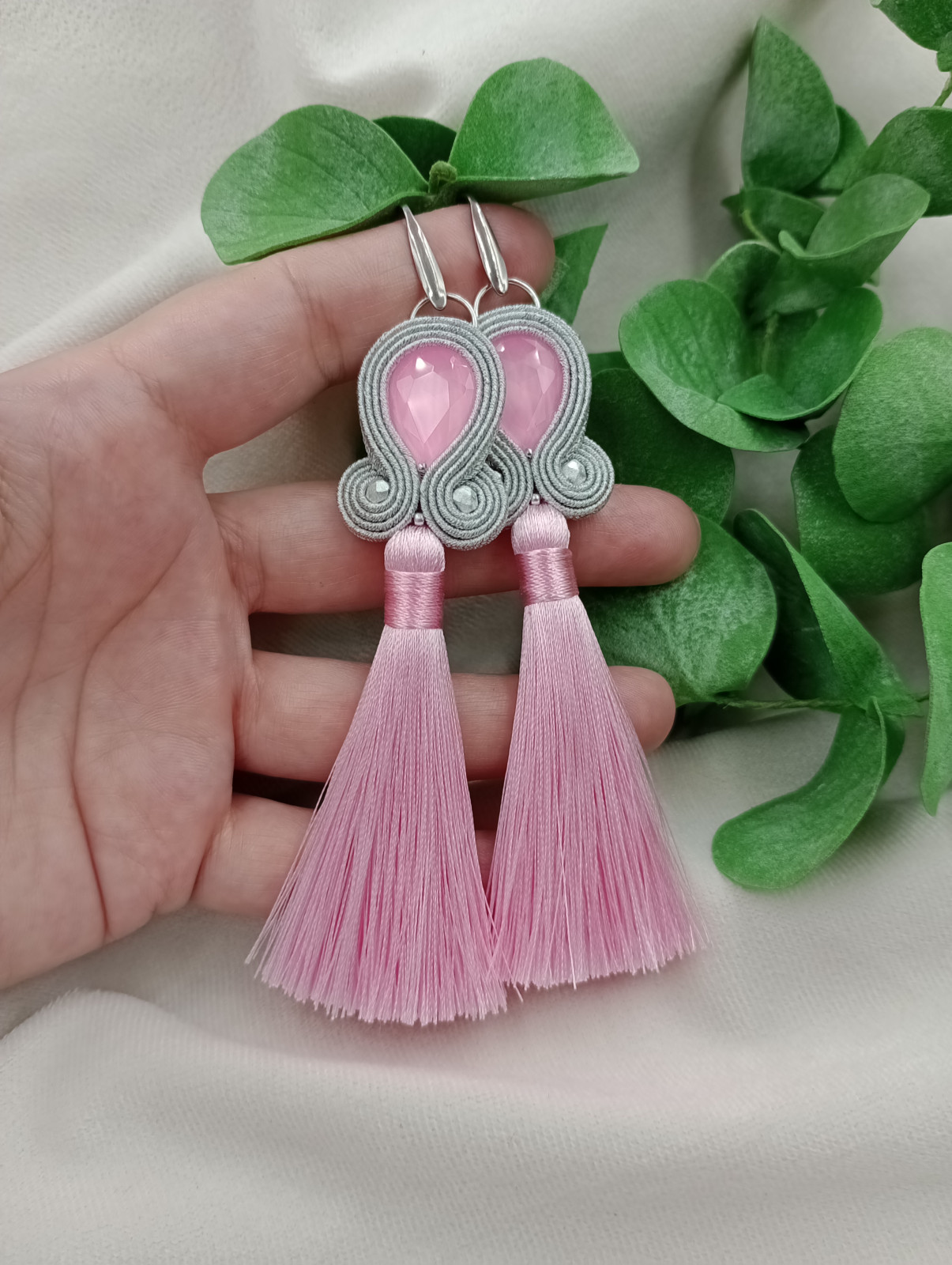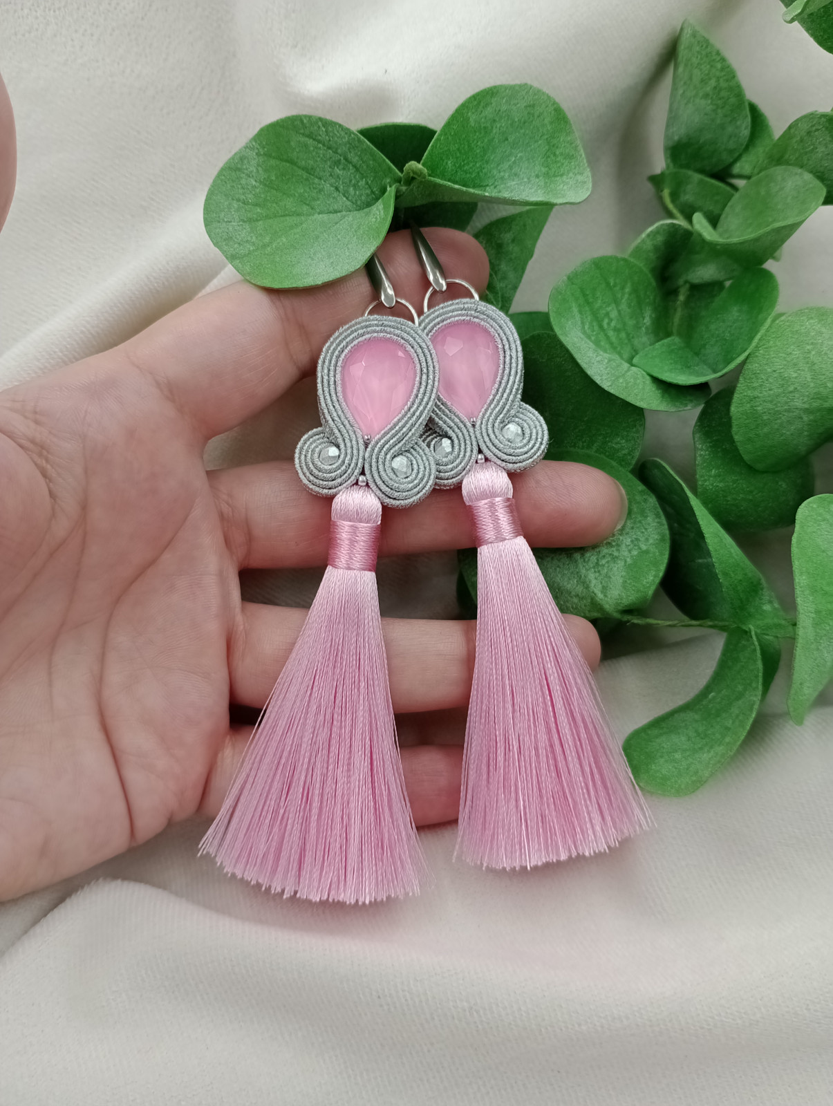 Długie kolczyki z chwostami, pudrowe różowe chwosty klipsy sztyfty soutache sutasz