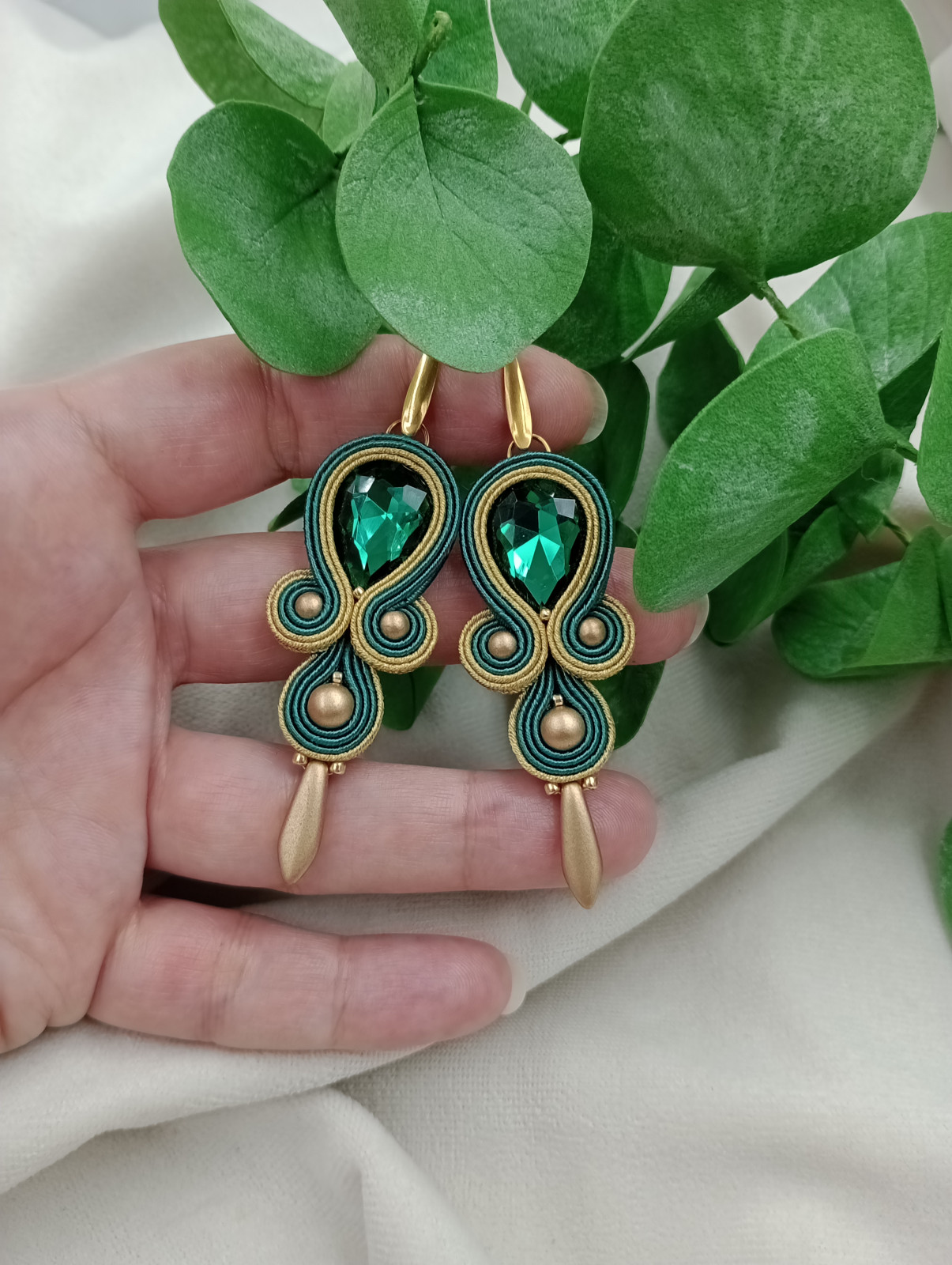 Kolczyki klipsy zielone butelkowe szmaragdowe złote soutache sutasz
