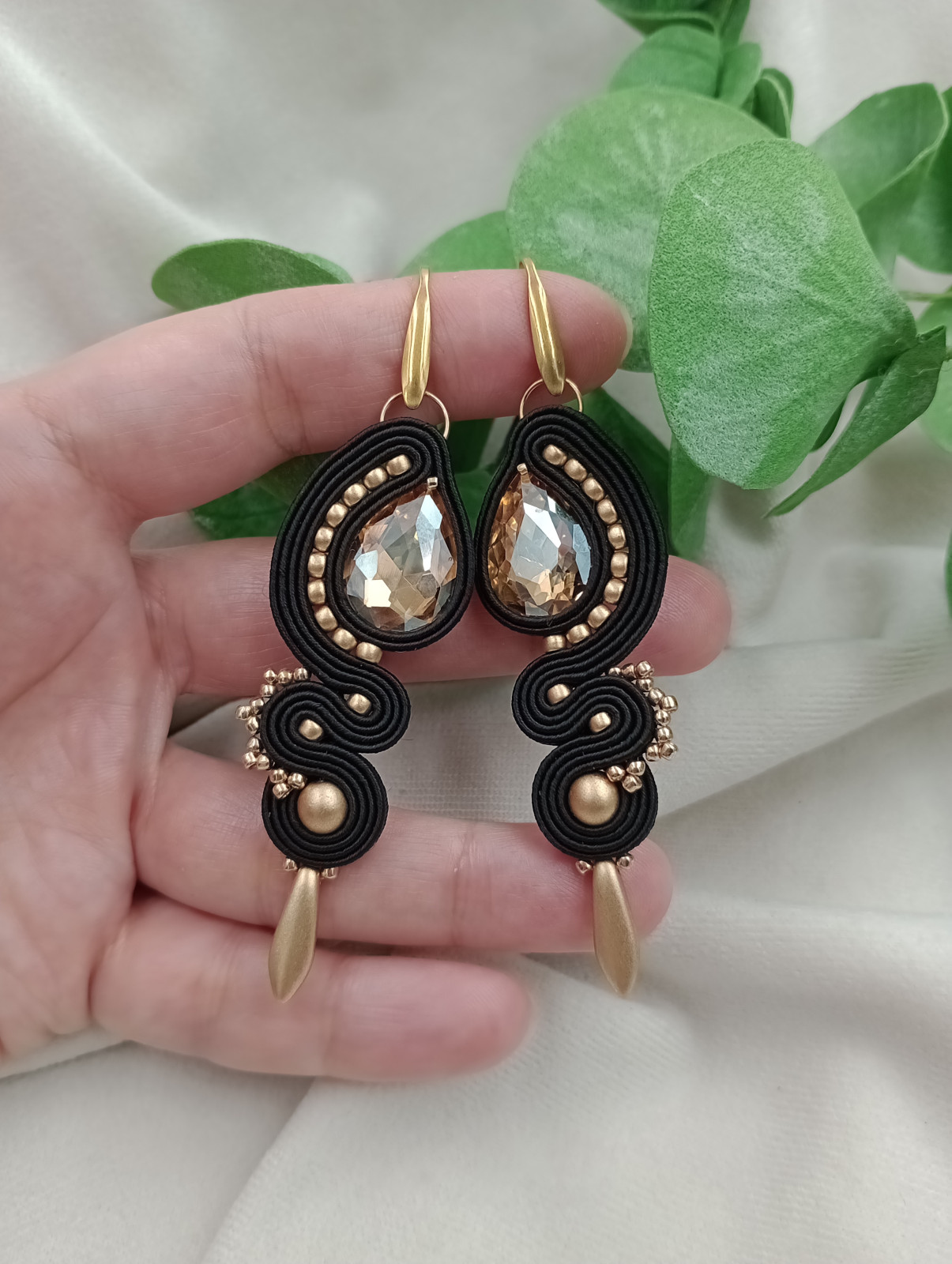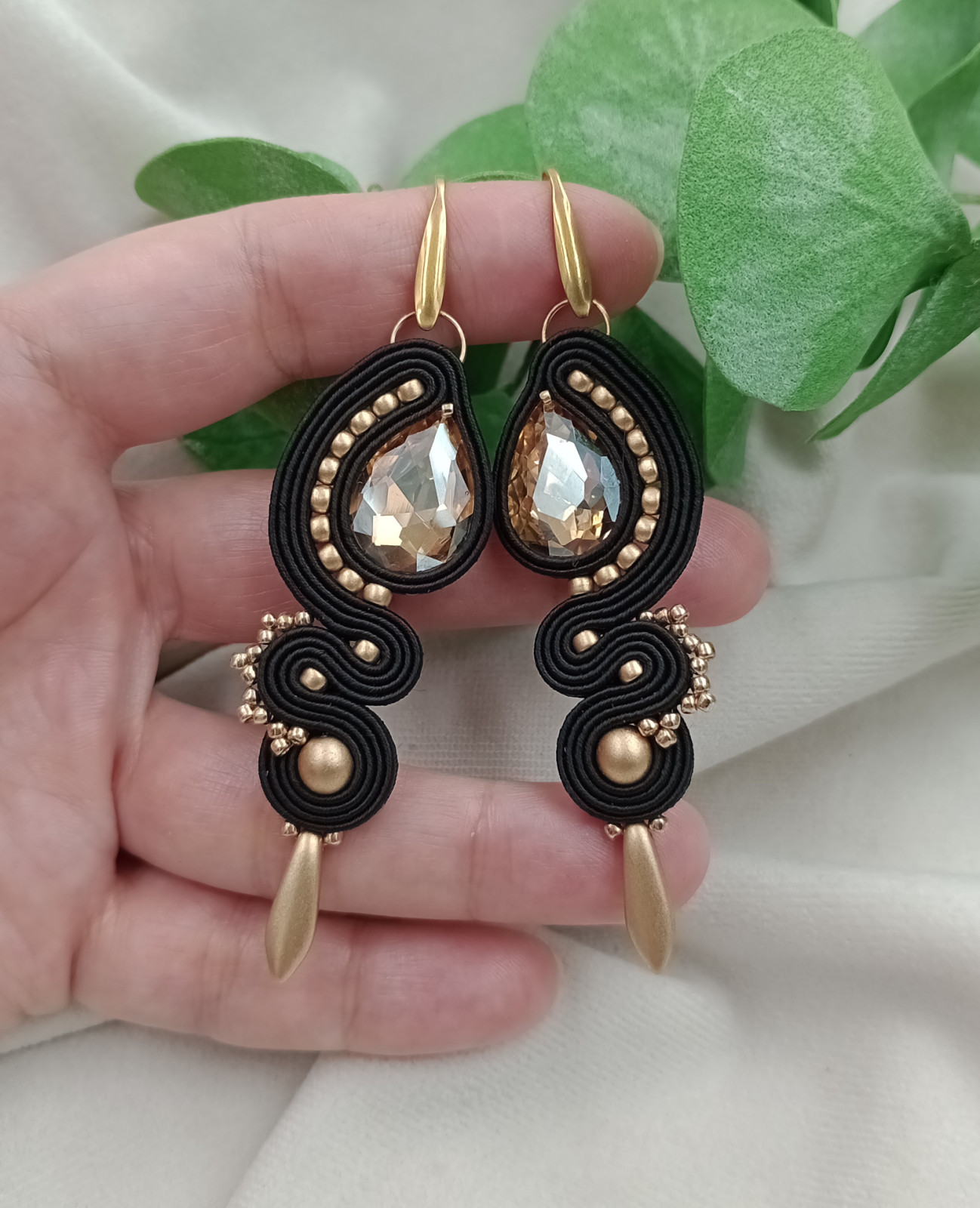 Kolczyki soutache czarne złote, czarne klipsy, długie kolczyki sutasz
