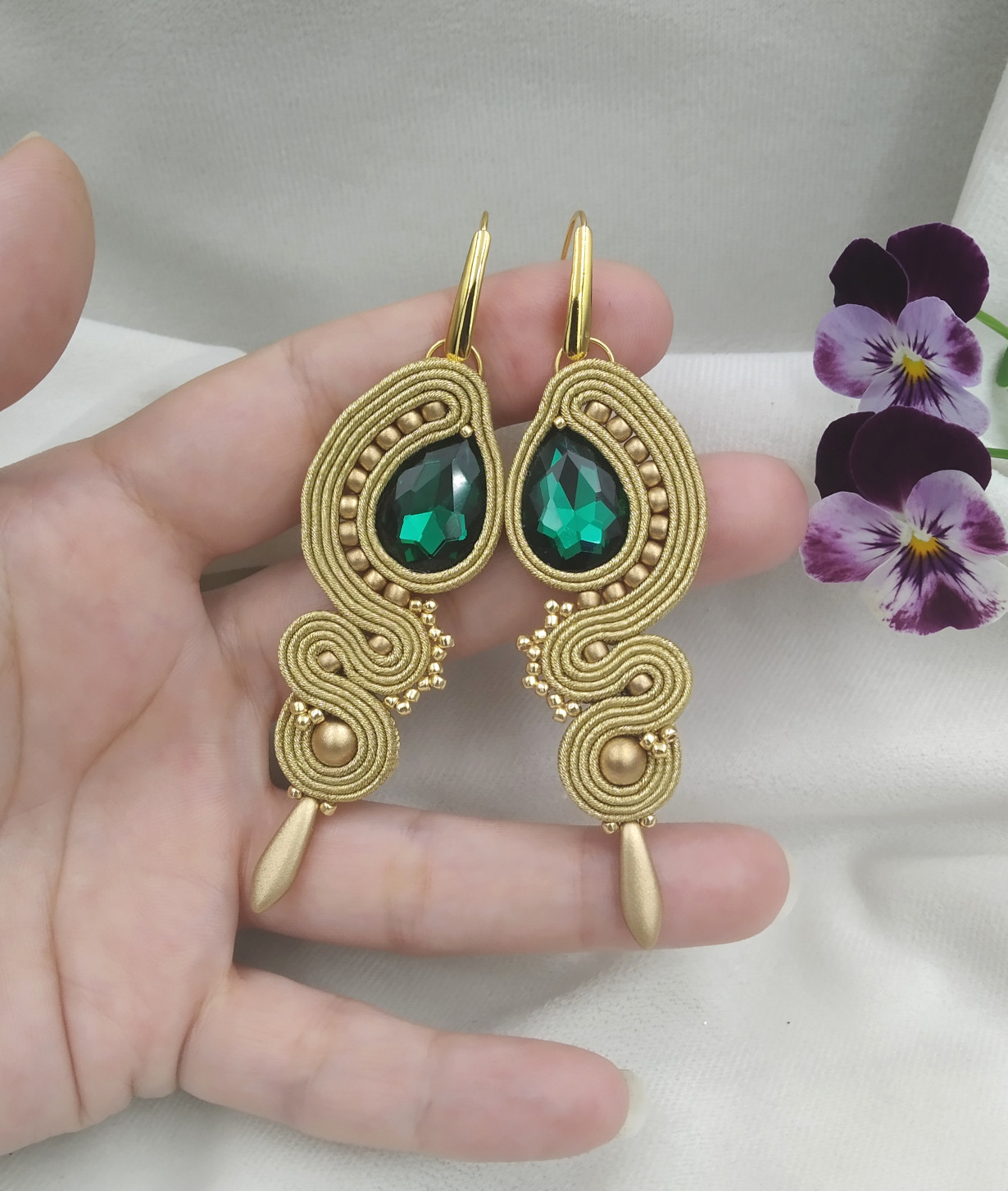 Kolczyki soutache Emerald, złote klipsy, szmaragdowe kolczyki sutasz