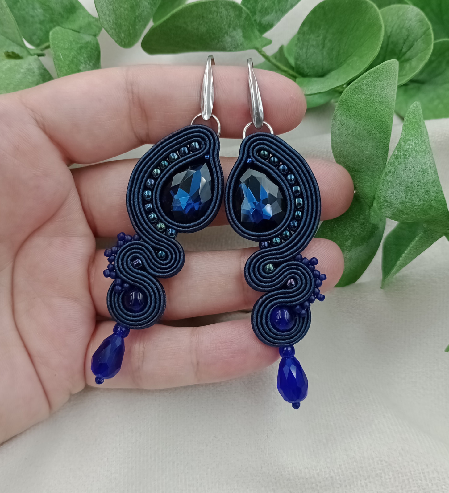 Kolczyki soutache niebieskie, granatowe klipsy, długie kolczyki sutasz