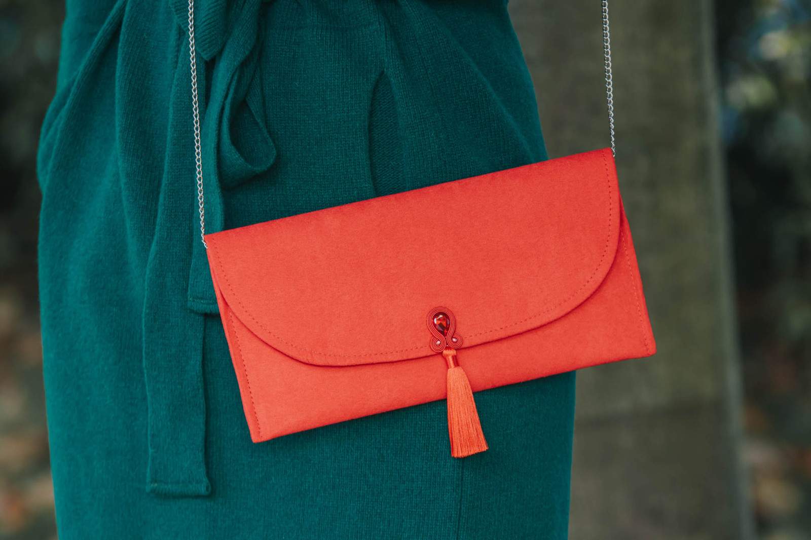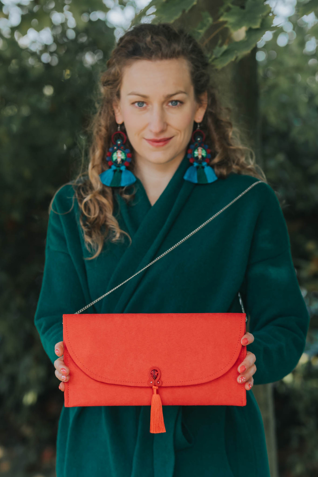 Czerwona kopertówka z chwostem, kopertówka z chwostem na długim łańcuszku na ramię (crossbody).