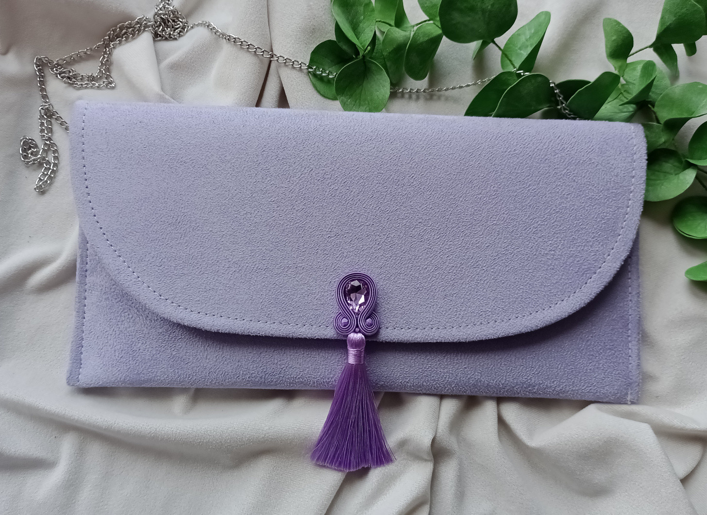 Jasnofioletowa kopertówka z chwostem, kopertówka fioletowa z chwostem w kolorze lawendy.