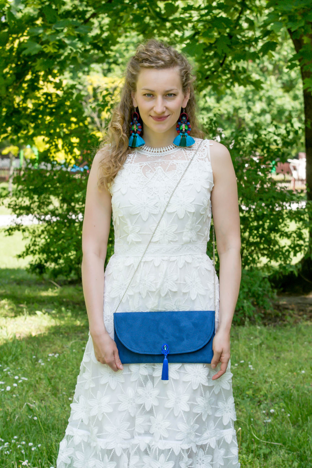 Niebieska kopertówka z chwostem, kopertówka z chwostem na długim łańcuszku na ramię (crossbody).