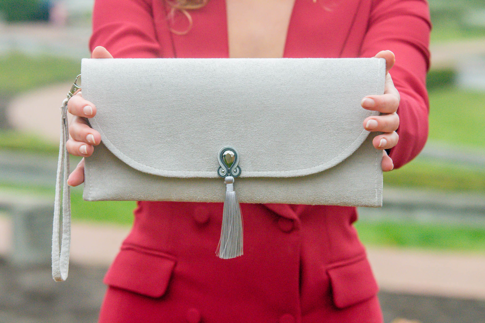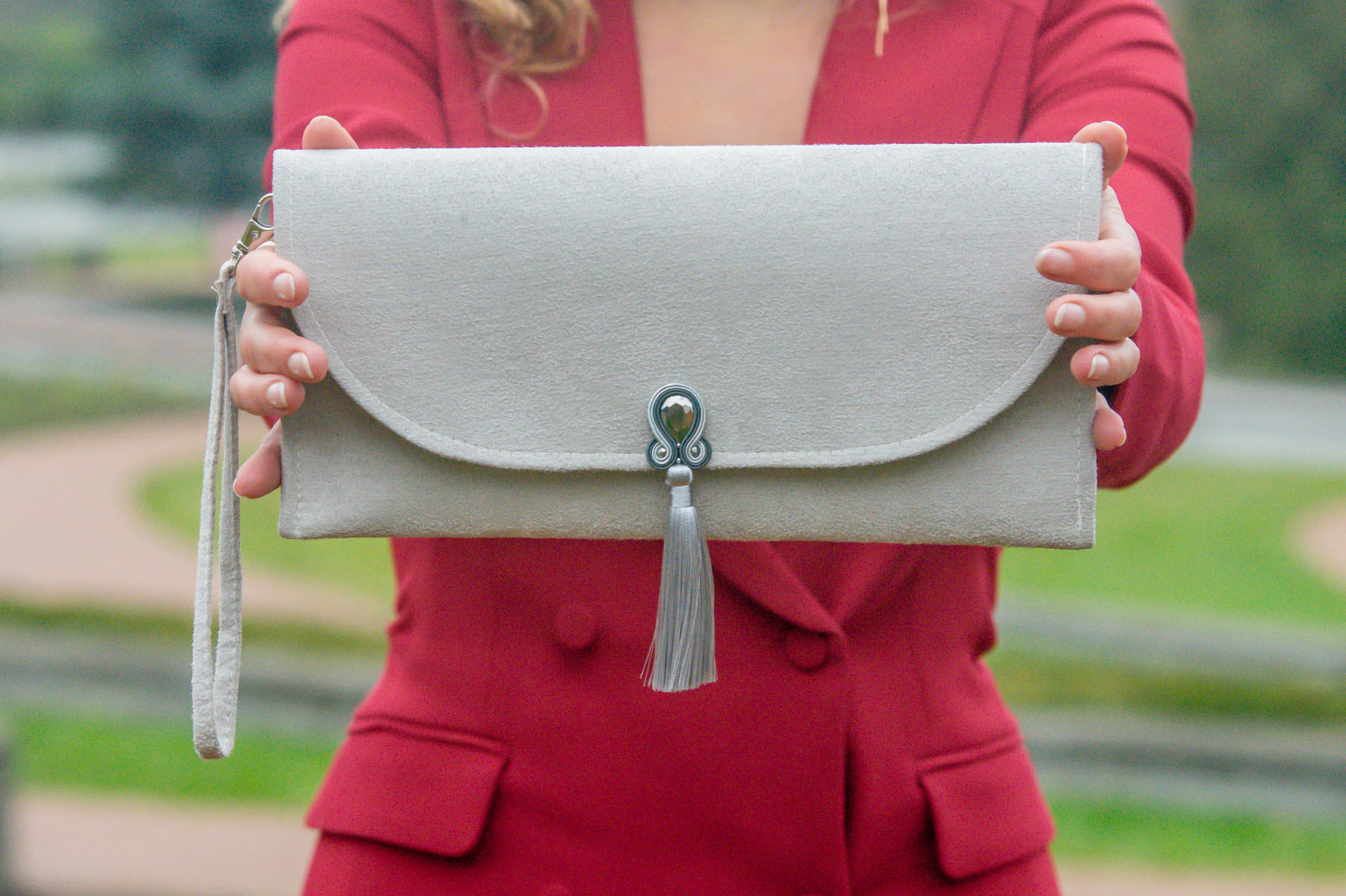 Jasnoszara kopertówka z chwostem, kopertówka siwa z chwostem w kolorze srebra.