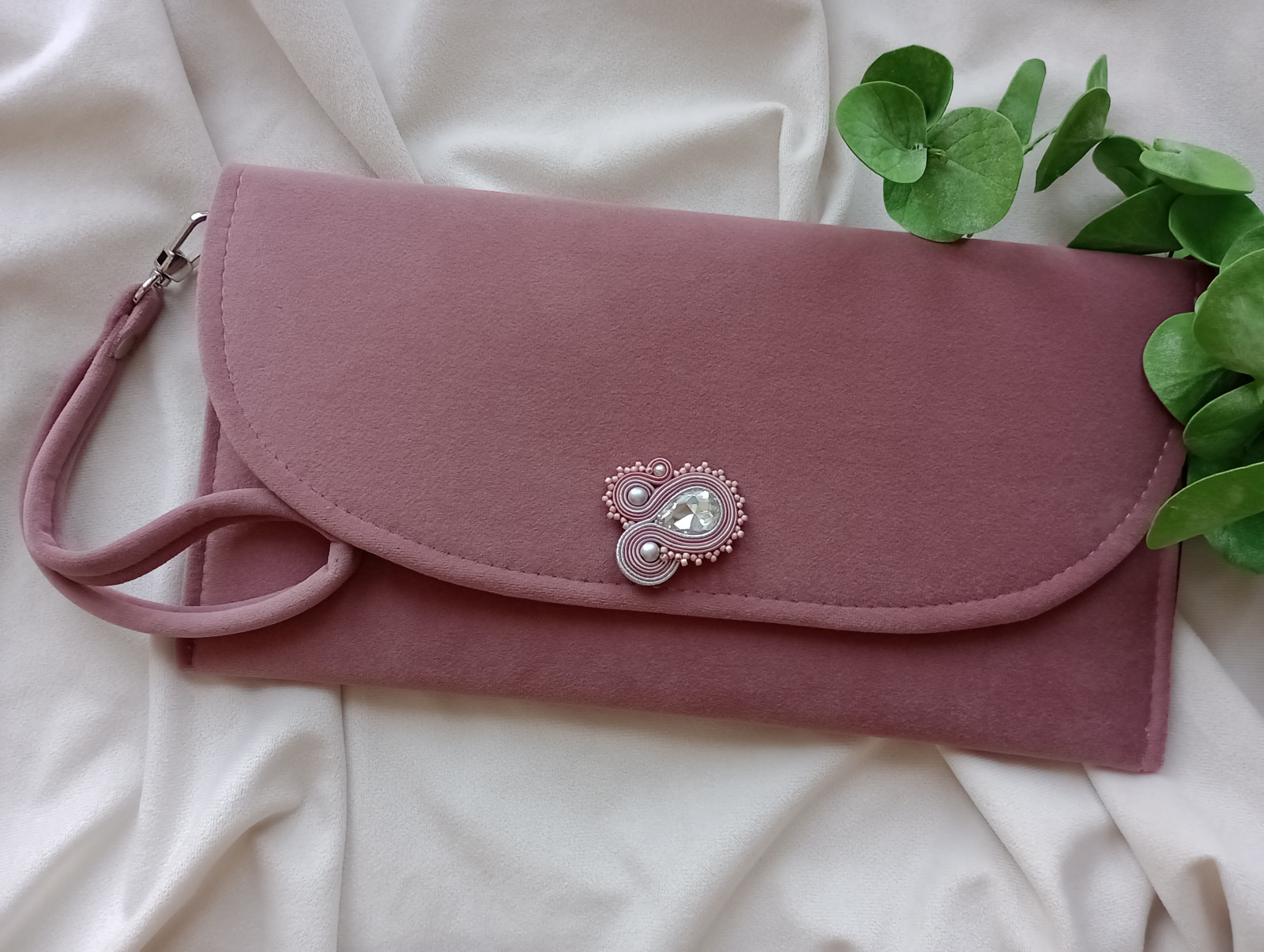 Nieduża, ale pakowna kopertówka z aplikacją sutasz, kopertówka w intrygującym kolorze zgaszonego różu, mauve.