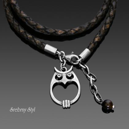 Sympatyczna autorska bransoletka z podwieszoną sówką, wykonana z plecionego rzemienia (3 mm) w kolorze czarno-brązowy melanż, ze srebrnymi zakończeniami i zapięciem. Elementy srebrne oksydowane i polerowane. Rzemień owija się dwukrotnie wokół nadgarstka a wykończony jest przedłużką z łańcuszka ozdobioną kulką turmalinu. Do kompletu można dokupić kolczyki oraz wisiorek. Biżuteria "z przymrużeniem oka" ale ciekawa i oryginalna.