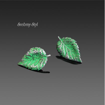 Śliczne kolczyki - sztyfty z motywem listka, wykonane od podstaw w naszej pracowni. Powierzchnia listków została pokryta patyną w kolorze świeżej, wiosennej zieleni a następnie przetarta i zaoksydowana, dzięki czemu uzyskaliśmy ciekawy efekt. Patynowaną powierzchnię zabezpieczyliśmy specjalnym lakierem przed procesami ciemnienia i zmiany barwy. Delikatna, wiosenna biżuteria.