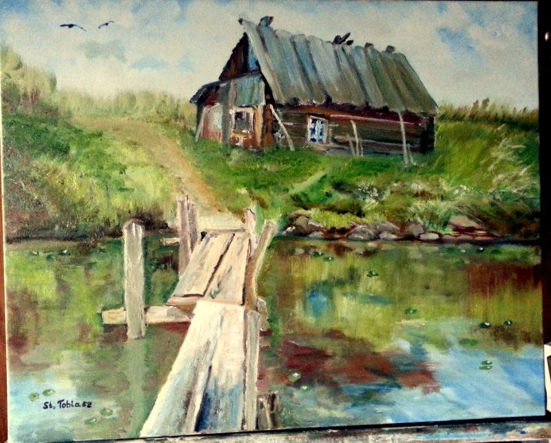 obraz olejny o wymiarach 40x50 "Chata nad wodą"