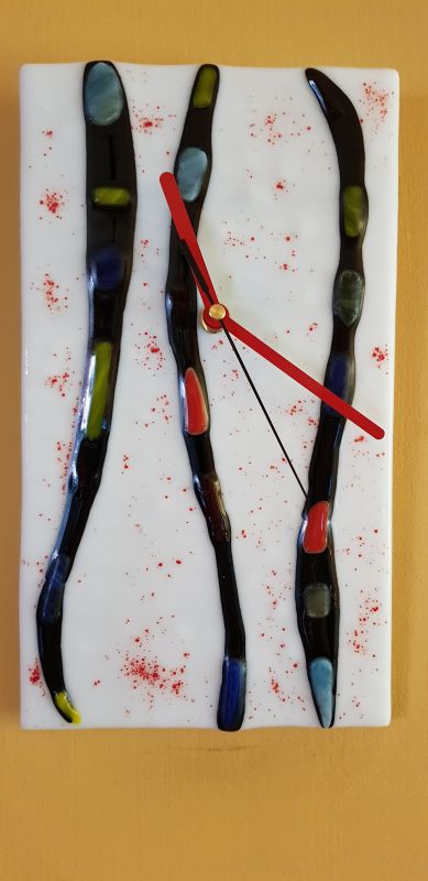 zegar ścienny ze szkła wykonany w technice fusingowej o wymiarach 30cm x 17cm