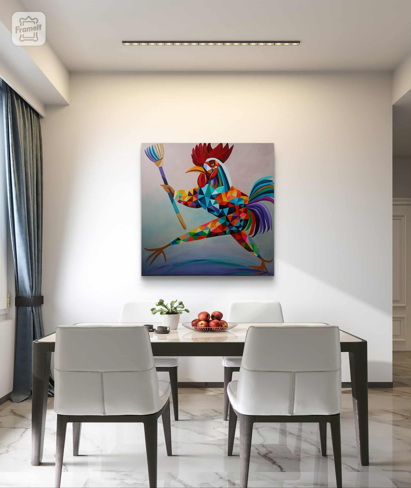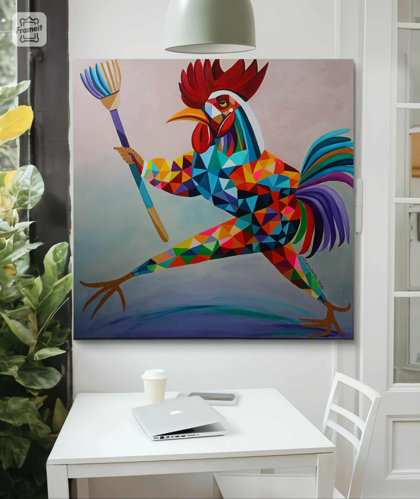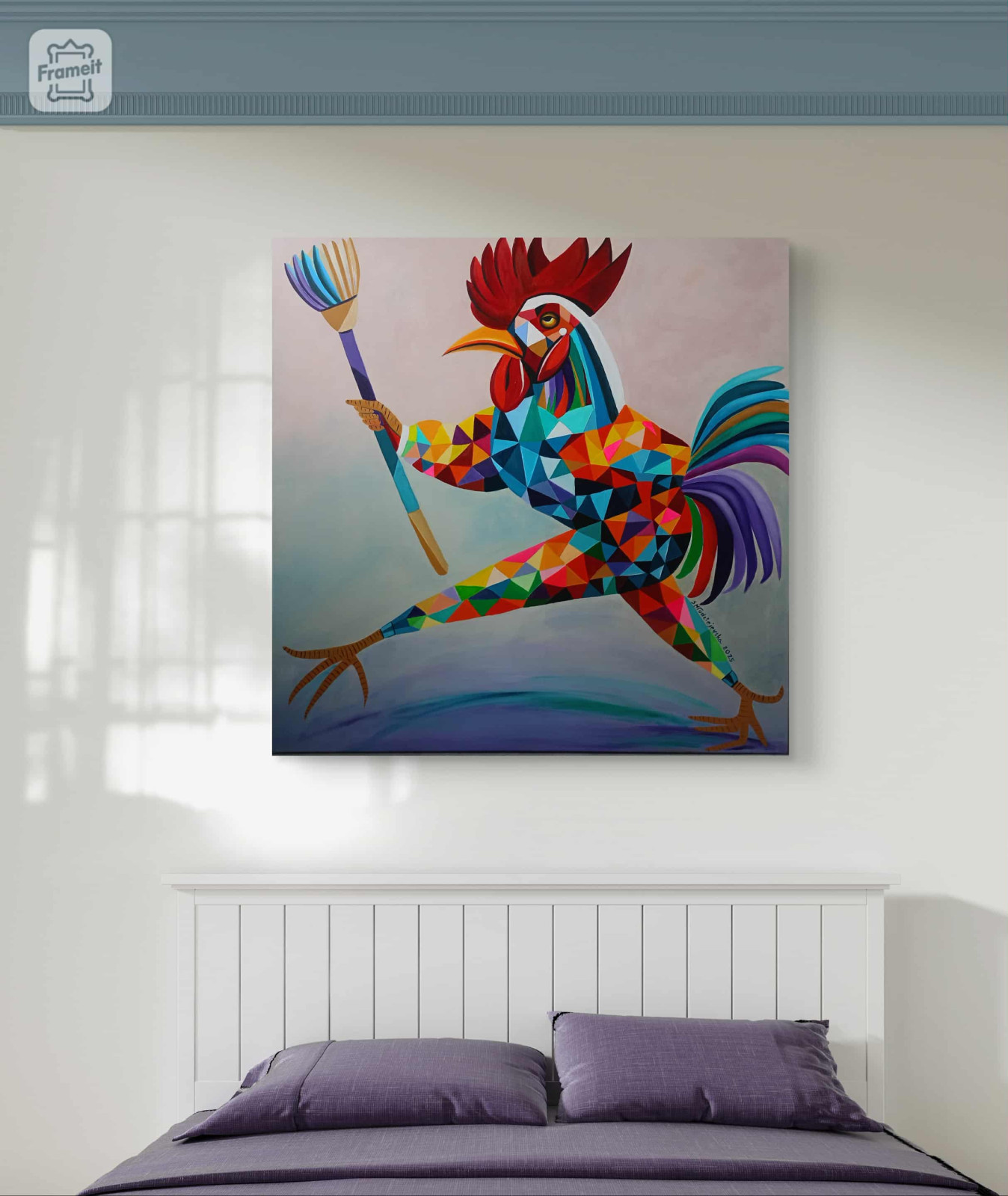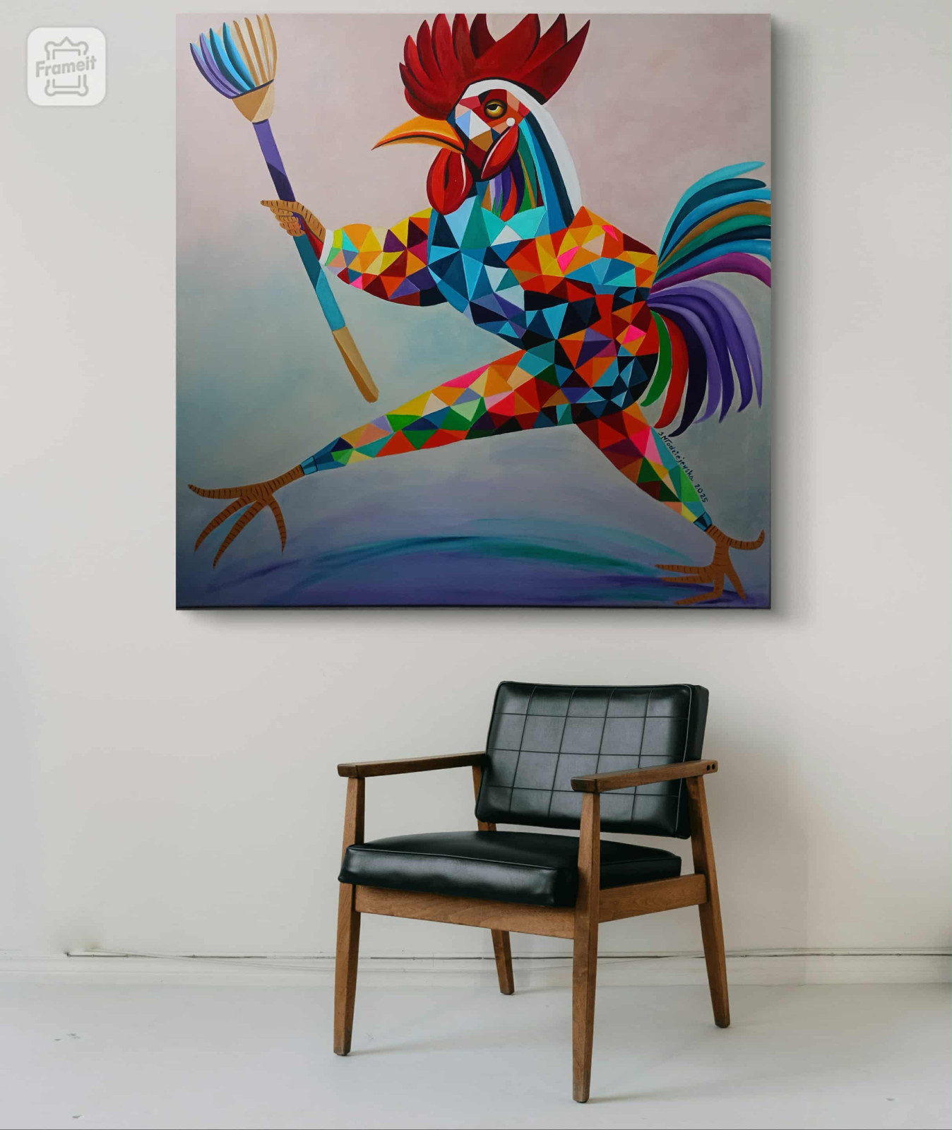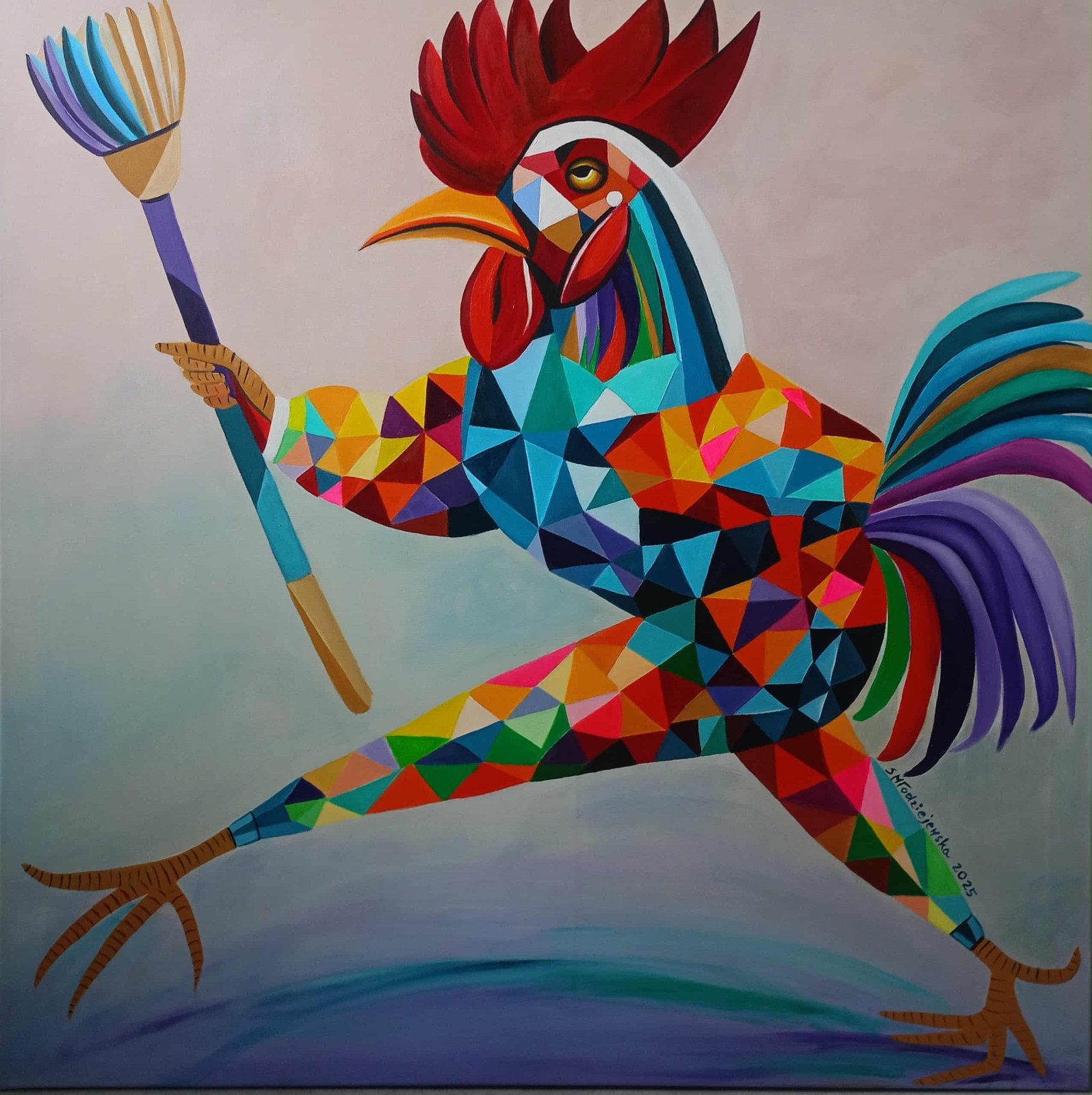 Czwartek! Sylwii Młodziejewskiej to pełne energii, geometryczne studium postaci, które czerpie z symboliki koguta i miotły, tworząc unikalną, kolorową i dynamiczną wizję.