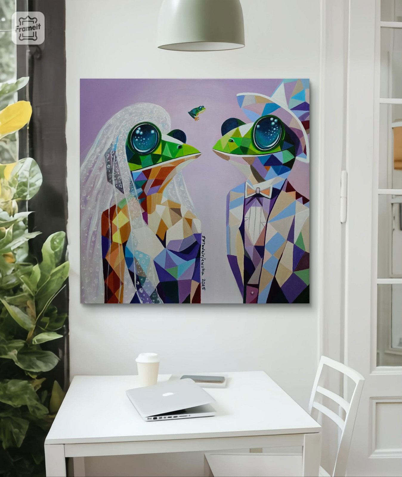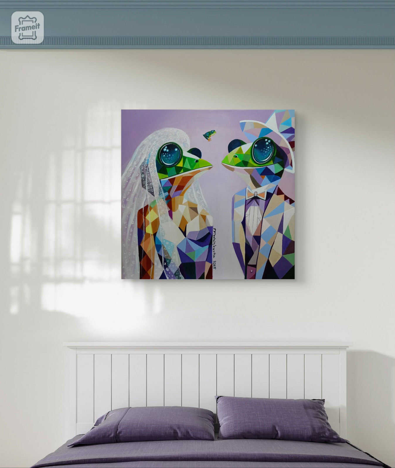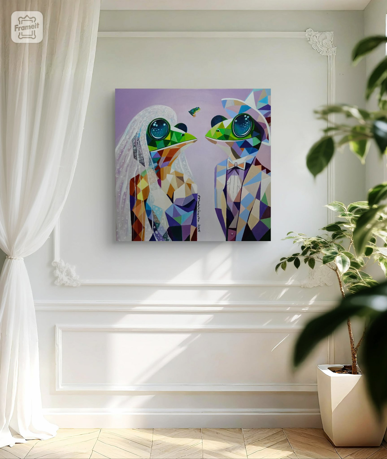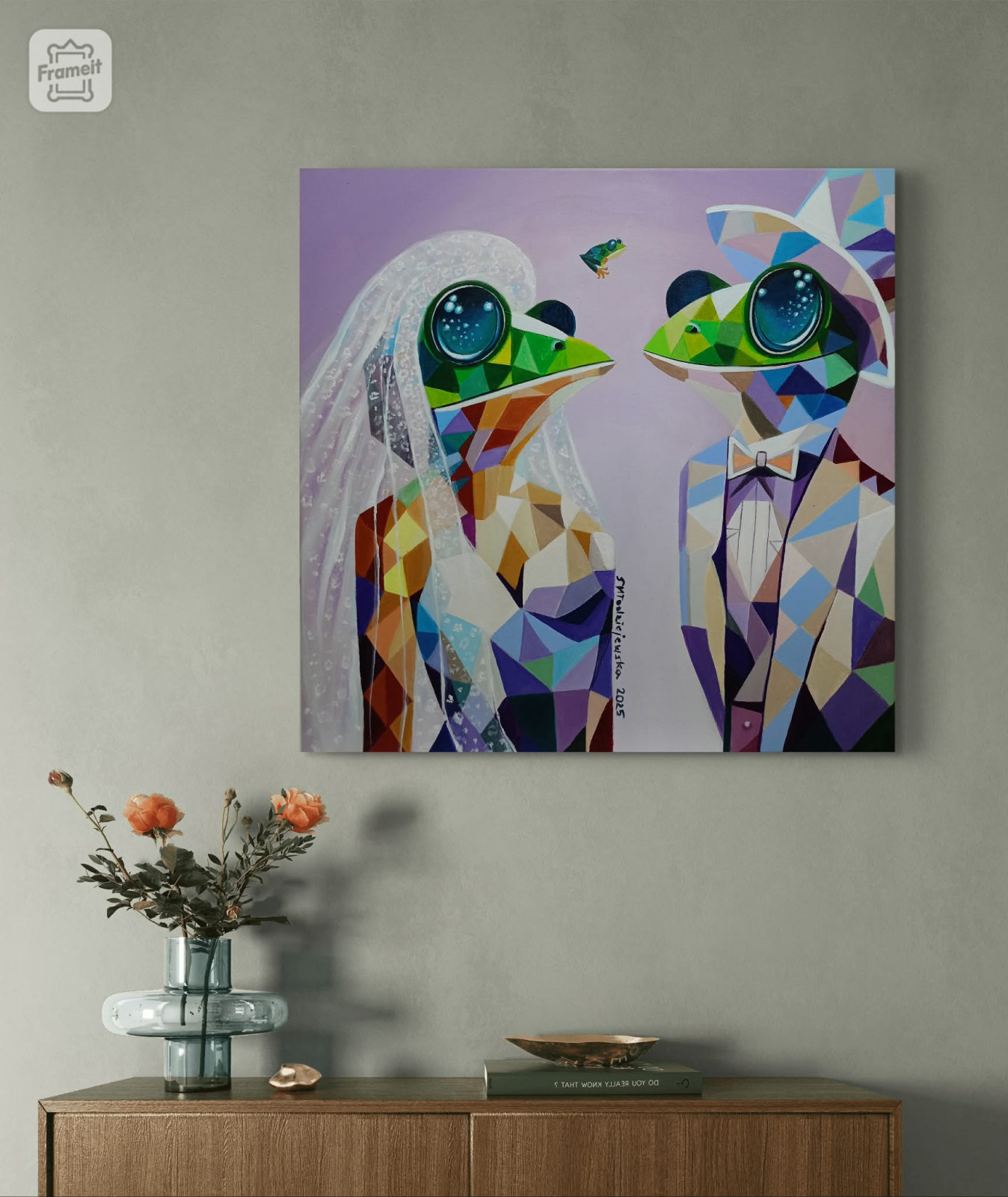 Na tym obrazie artystka ukazuje ptaki w sposób pełen ciepła i humoru, nadając im ludzkie cechy postaci teścia i teściowej. Kolorowe pióra dopełniają zabawny i sympatyczny nastrój, podkreślając wyjątkową atmosferę portretu. Żywe kolory i figuralny styl przyciągają uwagę, a inteligentny dowcip nadaje dziełu niepowtarzalny charakter, który zachwyci każdego miłośnika sztuki i przyrody.
