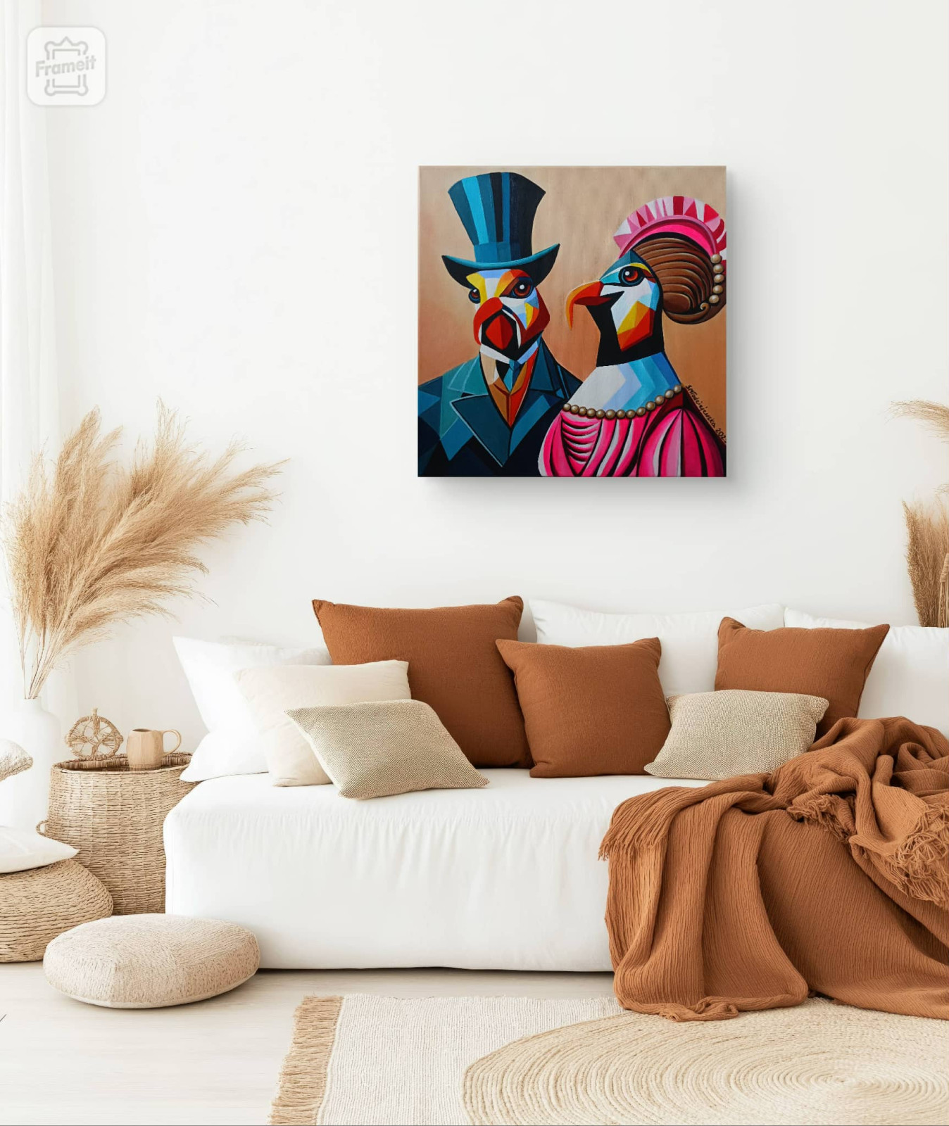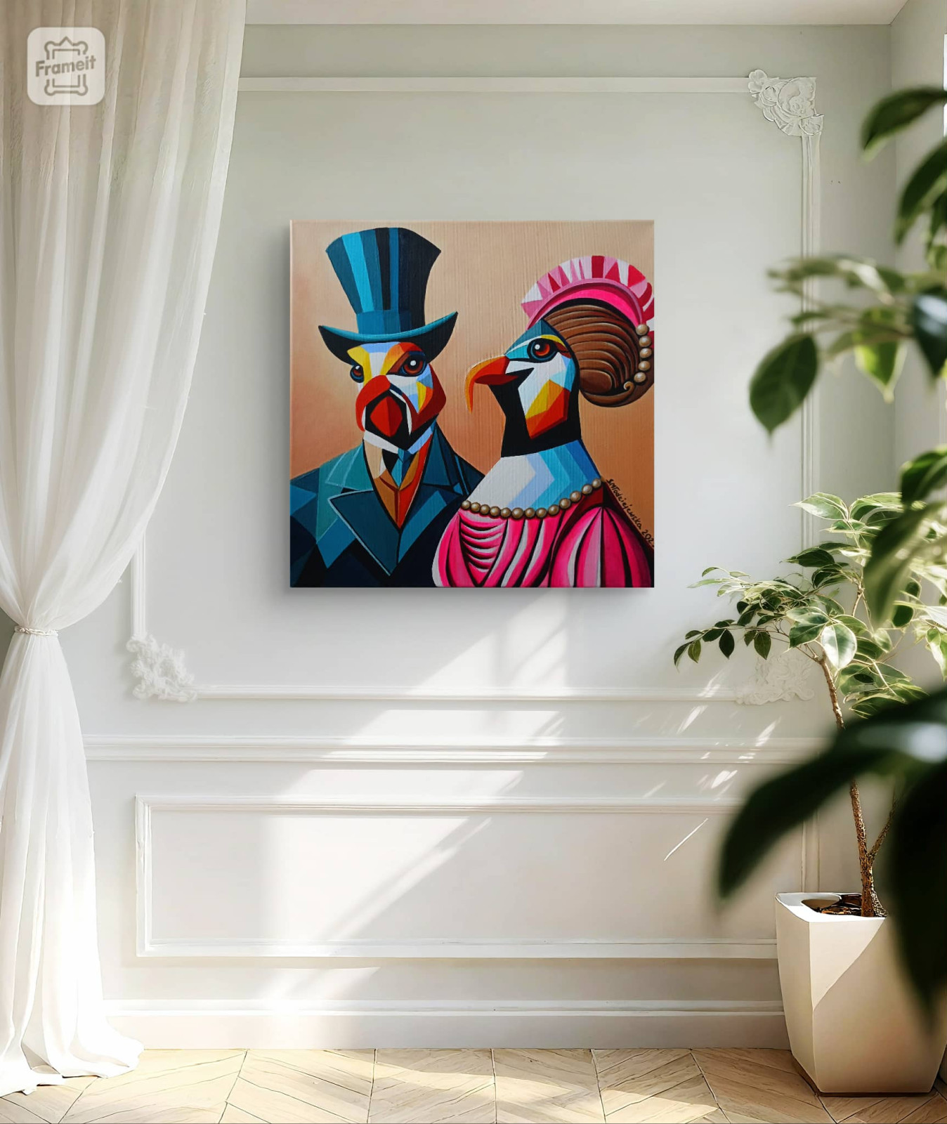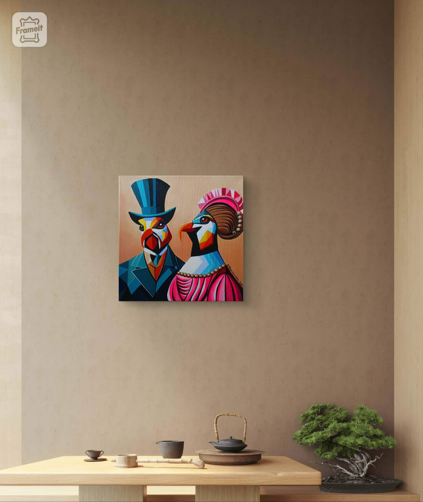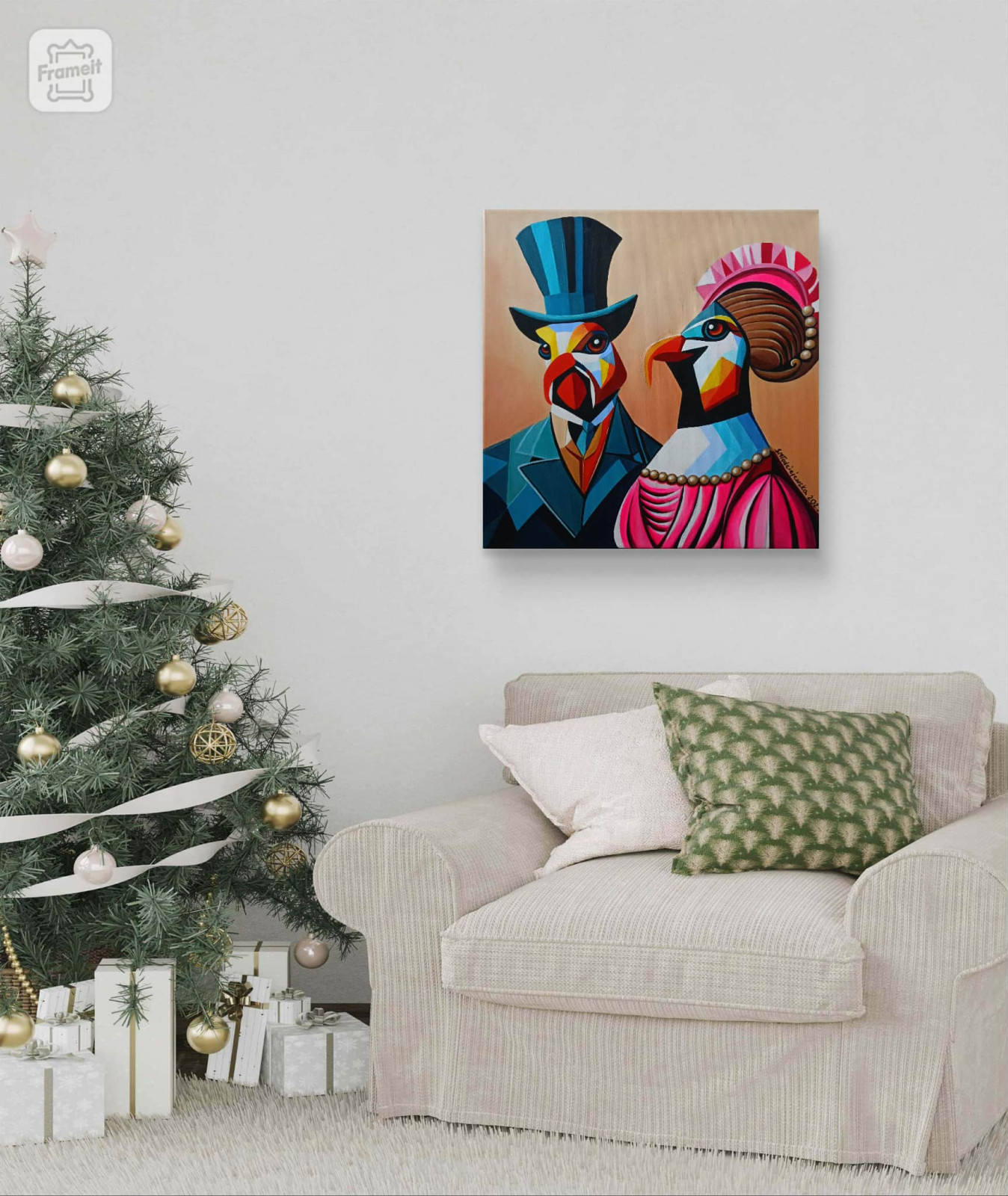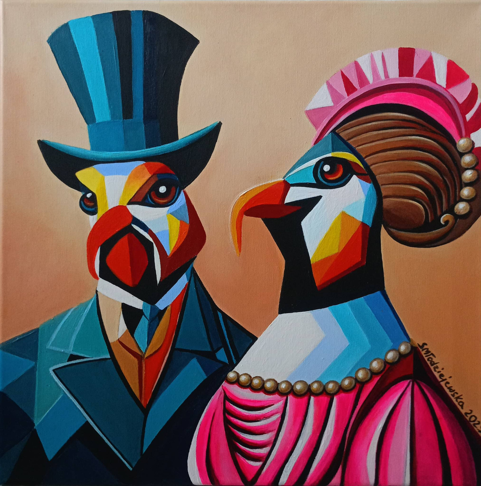 Na tym obrazie artystka ukazuje ptaki w sposób pełen ciepła i humoru, nadając im ludzkie cechy postaci teścia i teściowej. Kolorowe pióra dopełniają zabawny i sympatyczny nastrój, podkreślając wyjątkową atmosferę portretu. Żywe kolory i figuralny styl przyciągają uwagę, a inteligentny dowcip nadaje dziełu niepowtarzalny charakter, który zachwyci każdego miłośnika sztuki i przyrody.