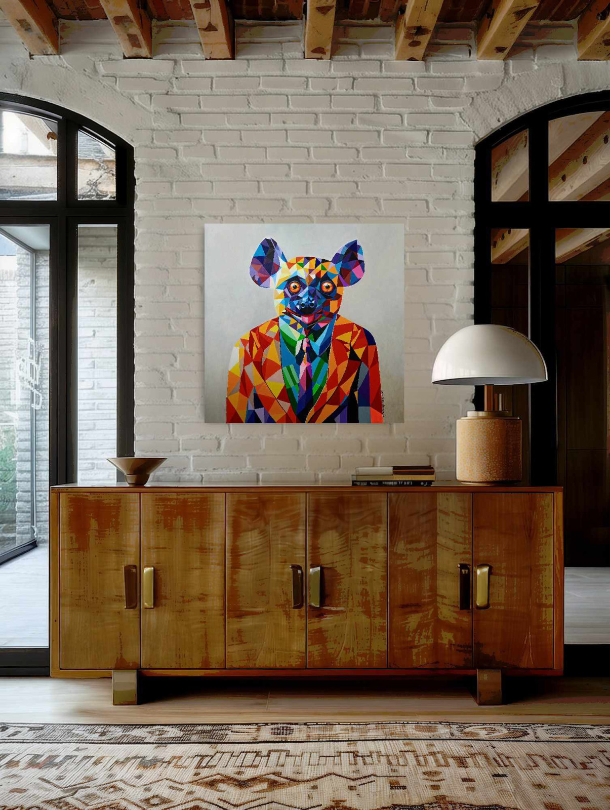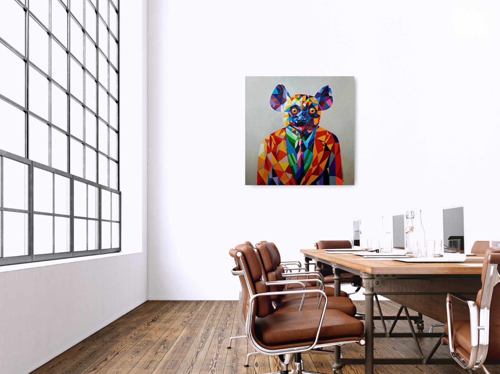 W tym dynamicznym obrazie Sylwia Młodziejewska mistrzowsko oddaje esencję komizmu i zabawy. Kolorowe maski i kostiumy postaci nawiązują do cyrkowego show, nadając dziełu żywiołowy i radosny charakter. Artystka wykorzystuje intensywne, nasycone barwy, aby podkreślić kontrast i dramatyzm figury, przy jednoczesnym zachowaniu nowoczesnego stylu Art Deco. Każdy element, od przemyślanych detali po szerokie pociągnięcia pędzla, wzbogaca narrację, tworząc pełną życia symfonię, która przyciąga wzrok i pobudza wyobraźnię. Obraz jest celebracją humoru, figlarności i zwierzęcych motywów, łącząc w sobie zarówno zabawne, jak i głębokie aspekty ludzkiej natury.