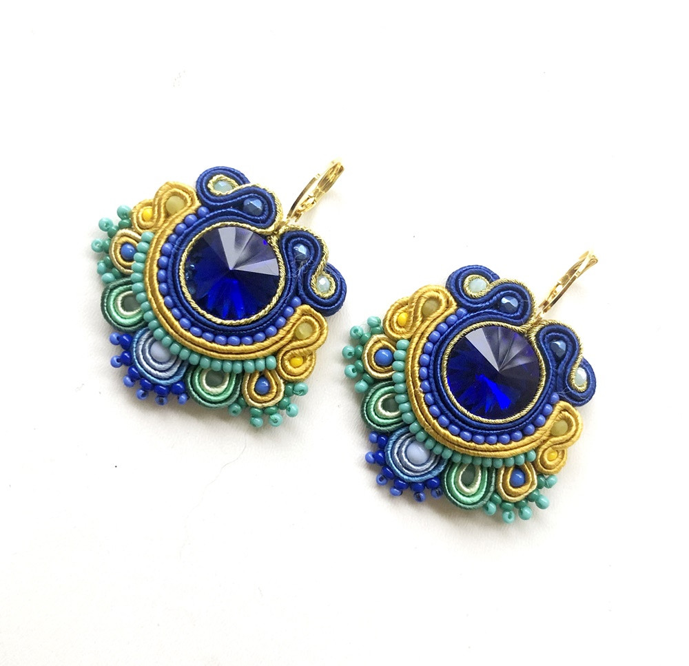 Wyjątkowe kolczyki z sutaszu - w połączeniu różnych odcieni żółtego, zieleni, szafiru i złota z okrągłym kryształkiem rivoli w odcieniu szafirowym. Długość 7 cm. Zawieszone na antyalergicznych biglach, możliwość wymiany na klipsy lub sztyfty. Kolczyki wykonywane są na zamówienie, w związku z czym nie ma możliwości zwrotu produktu.