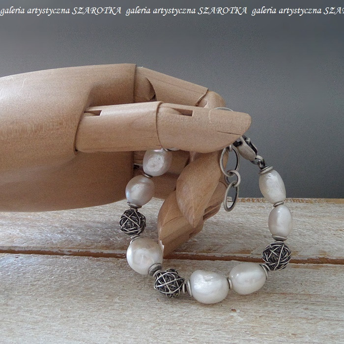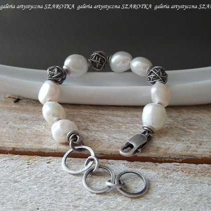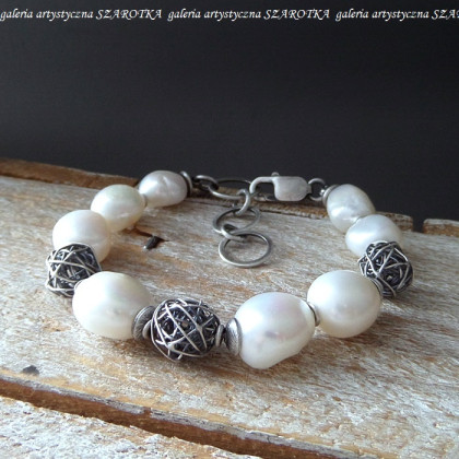 Masywna bransoleta wykonana z pięknych, lekko nieregularnych, białych, naturalnych pereł wielkości ok. 12-14 x 12 mm i oksydowanego srebra pr. 925, w tym kłębki o średnicy ok. 11 mm. Długość - 18,5 cm + przedłużka - 3,8 cm. Perły posiadają naturalne niedoskonałości