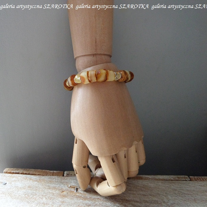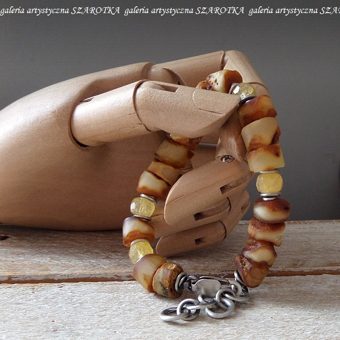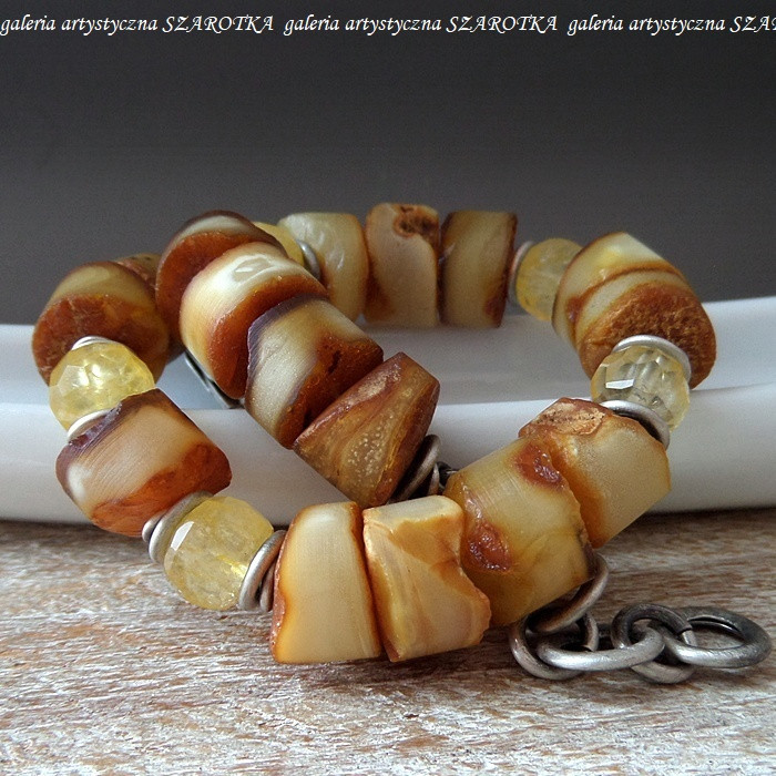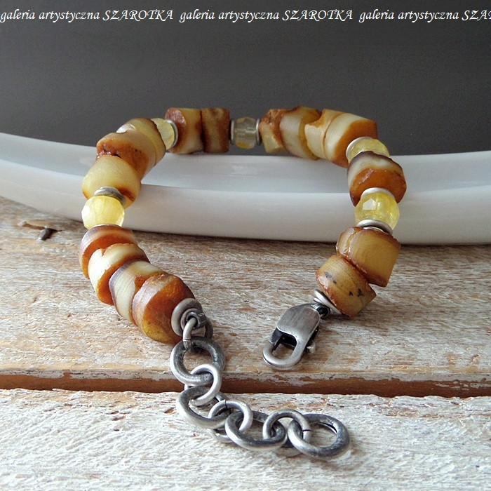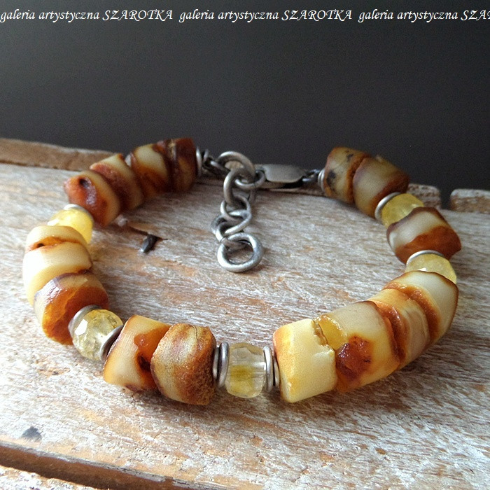 Bransoletka wykonana z nieregularnych plastrów naturalnego bursztynu wielkości ok. 11 x 6-8 mm, fasetowanych fasetowanych oponek cytrynu wielkości 8 x 6 mm oraz oksydowanego srebra pr. 925. Długość - 18,9 cm + przedłużka - 3,5 cm. Bransoletka jest lekka