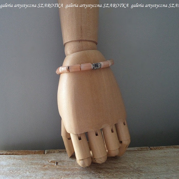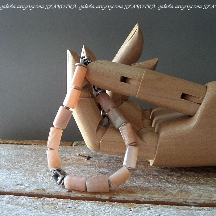 Bransoletka wykonana z beżowo-brzoskwiniowego kamienia słonecznego w postaci ciosanych bryłek wielkości ok. 10 x 6 mm oraz oksydowanego srebra pr. 925, w tym gnieciony sześcian - 6 x 6 x 6 mm . Długość - 18 cm + przedłużka - 3,6 cm