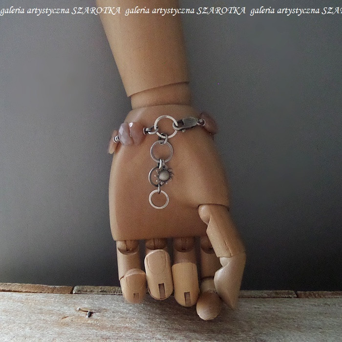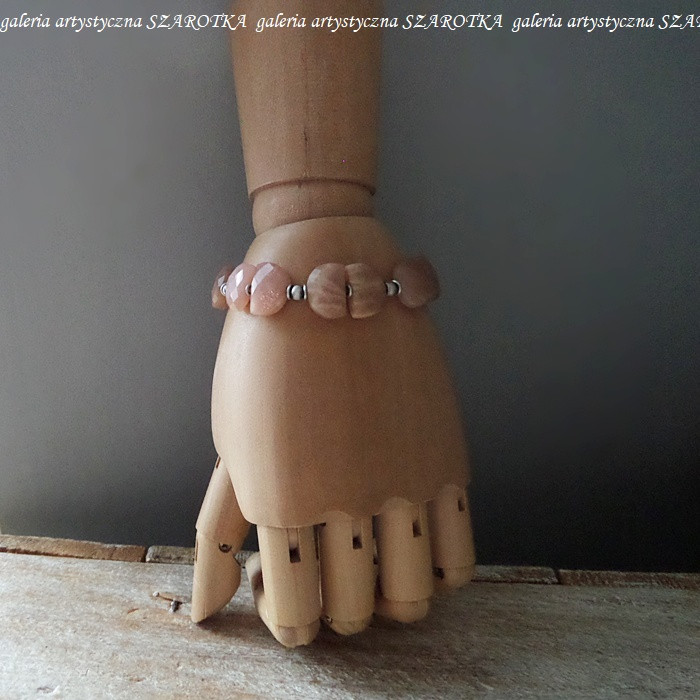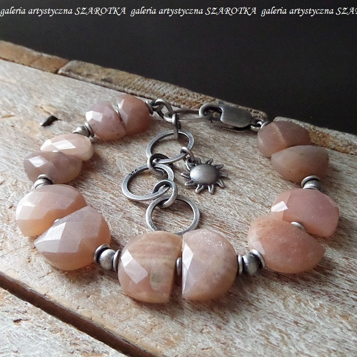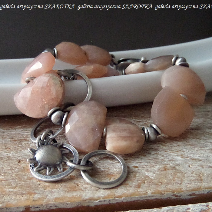 Bransoletka wykonana z beżowo-brzoskwiniowego kamienia słonecznego w postaci fasetowanych półksiężyców wielkości ok. 13-15 x 7-12 x 4-5 mm i oksydowanego srebra pr. 925, w tym zawieszka w kształcie jednostronnie wypukłego słoneczka o średnicy 11 mm. Długość regulowana - max. 23 cm. Kamienie posiadają drobne, naturalne spękania