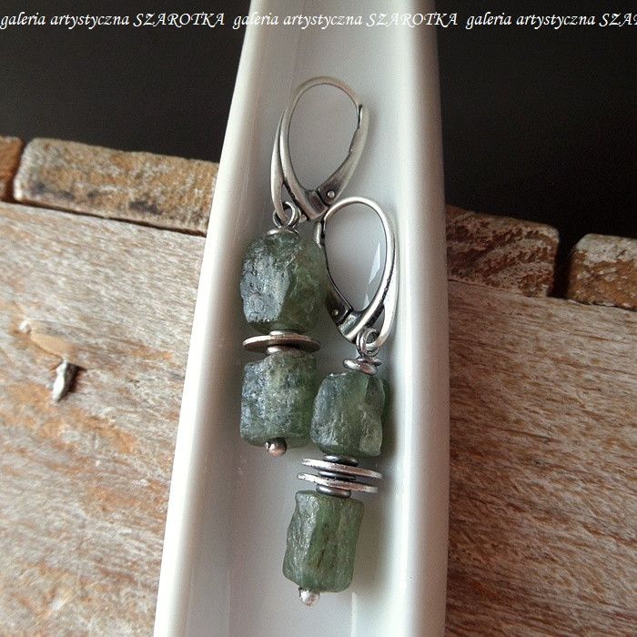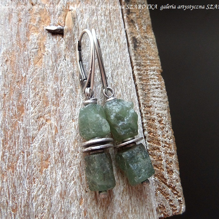 Kolczyki wykonane z surowych bryłek zielonego apatytu, wielkości ok. 9-10 x 7 mm oraz oksydowanego srebra pr. 925. Długość - 4,3 cm