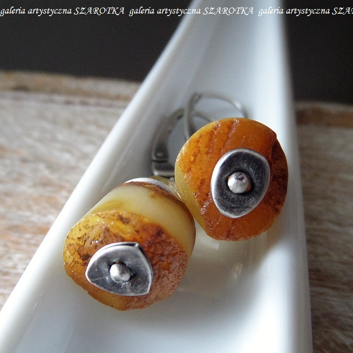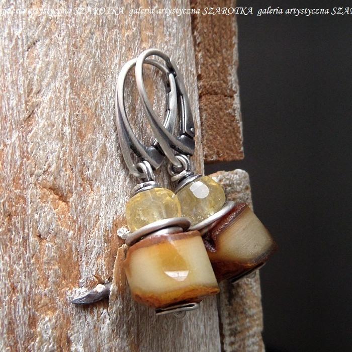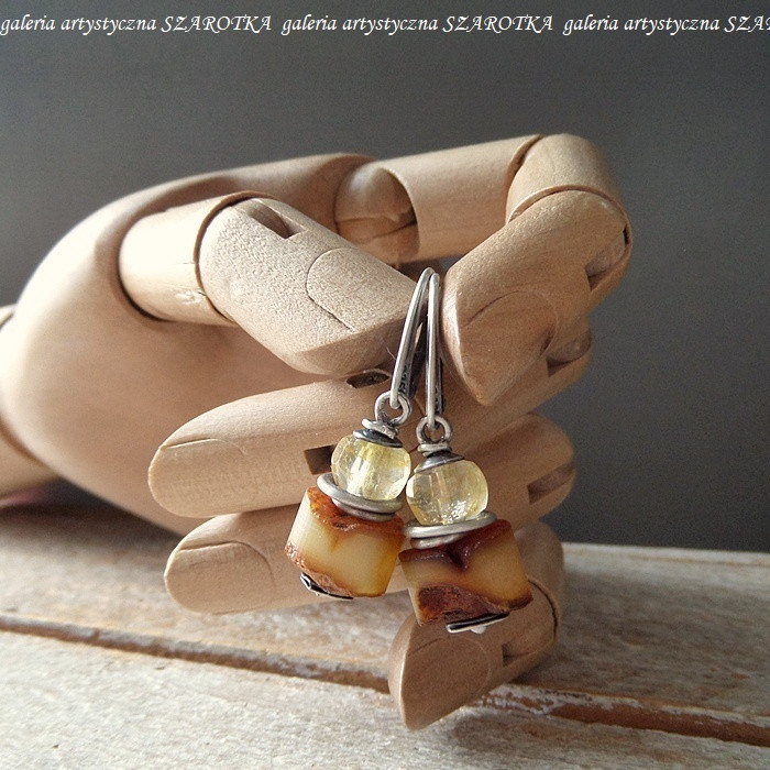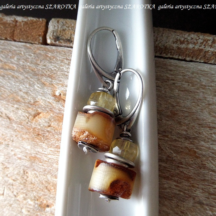 Kolczyki wykonane z matowych, nieregularnych plastrów naturalnego bursztynu wielkości ok. 11 x 7-8 mm, fasetowanych oponek cytrynu wielkości 8 x 6 mm i oksydowanego srebra pr. 925. Długość - 3,7 cm. Kolczyki są lekkie