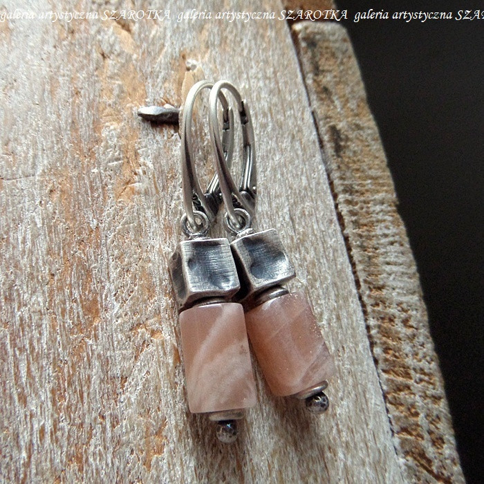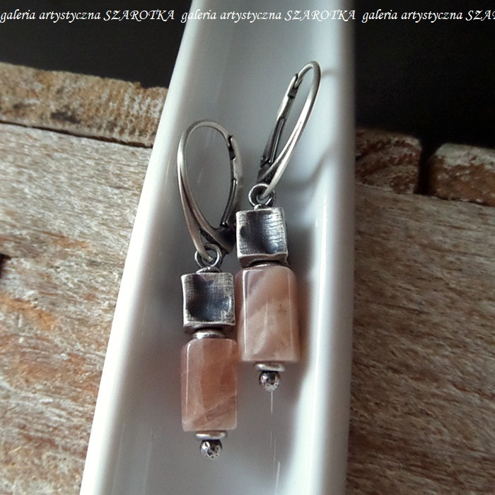 Kolczyki wykonane z beżowo-brzoskwiniowego kamienia słonecznego w postaci ciosanych bryłek wielkości ok. 10 x 6 mm oraz oksydowanego srebra pr. 925, w tym gniecione sześciany - 6 x 6 x 6 mm . Długość - 4 cm