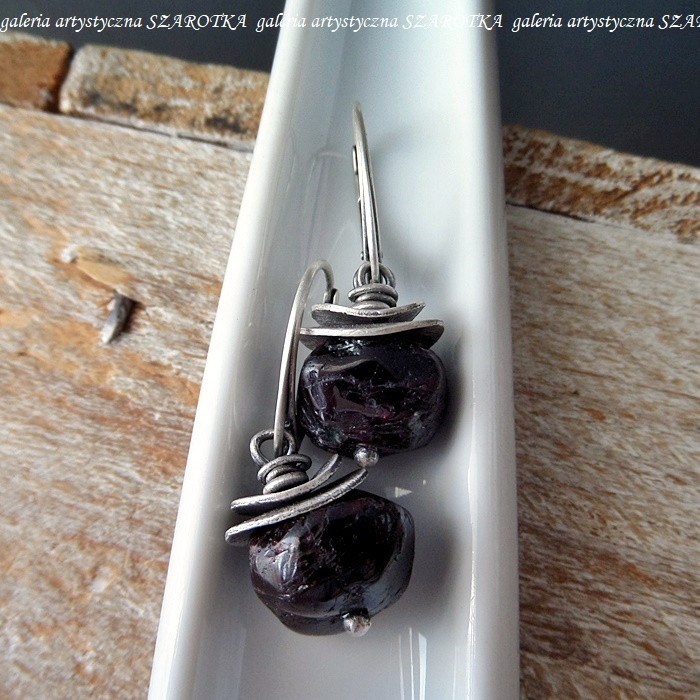 Kolczyki wykonane z polerowanych bryłek granatu wielkości ok. 13 x 10 mm i oksydowanego srebra pr. 925. Długość - 3,1 cm. Granaty posiadają naturalne spękania i nierówności