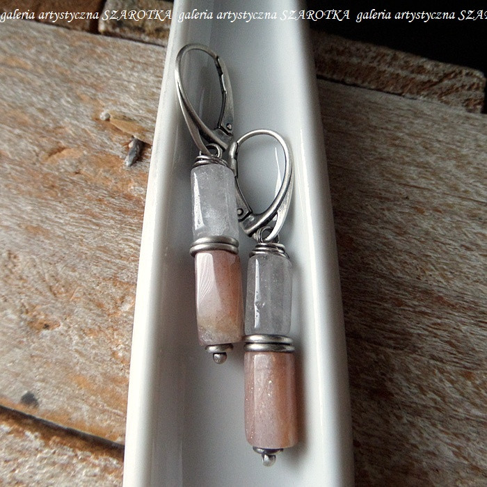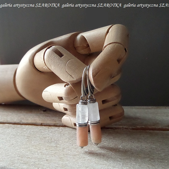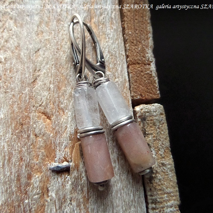 Smukłe kolczyki wykonane z kryształu górskiego i kamienia słonecznego w postaci ciosanych, lekko nieregularnych walców wielkości ok. 11 x 6 mm i oksydowanego srebra pr. 925. Długość - 4,6 cm