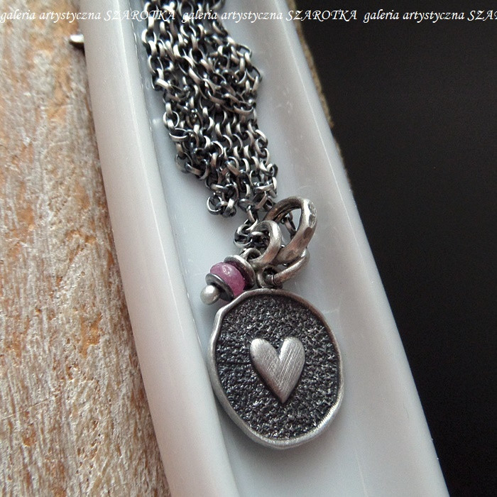 Subtelny naszyjnik wykonany z maleńkiej, fasetowanej oponki różowego turmalinu wielkości ok. 4 x 2 mm i oksydowanego srebra pr. 925, w tym lekko nieregularna zawieszka z serduszkiem o średnicy ok. 15 mm. Długość łańcuszka - 50 cm. Zdjęcia przedmiotu wykonane są w skali makro, proszę sugerować się podanymi wymiarami