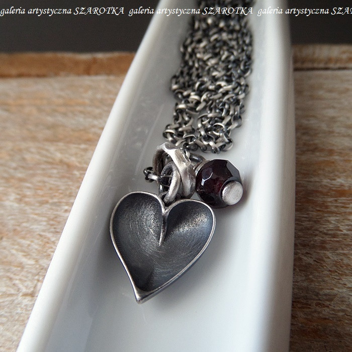 Romantyczny naszyjnik wykonany z fasetowanej oponki granatu wielkości 6 x 5 mm i oksydowanego srebra pr. 925, w tym jednostronnie wypukłe serce wielkości 14 x 12 mm. Długość łańcuszka - 50 cm. Zdjęcia przedmiotu wykonane są w skali makro, proszę sugerować się podanymi wymiarami
