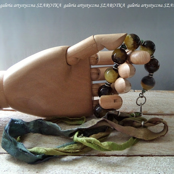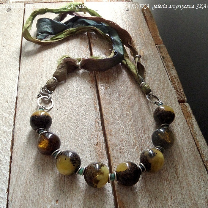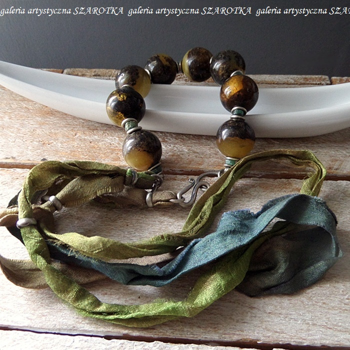 w JEDWABIACH naszyjnik z bursztynu, szmaragdu, jedwabiu i srebra