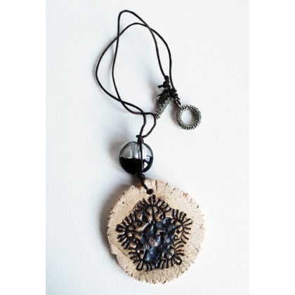 Oryginalny etniczny wisior wykonany z jasnej szamotowej gliny, szkliwiony opalizującym brązowym szkliwem. Wypalony w temp. ok. 1100 st. C. W orientalny wzór zatopione zostało prawdziwe srebro, które podczas wypalania wtopiło się w strukturę wisiorka. Całość zwieńczona koralikiem ze szkła weneckiego. Naszyjnik zapinany na wygodne srebrzone zapięcie.